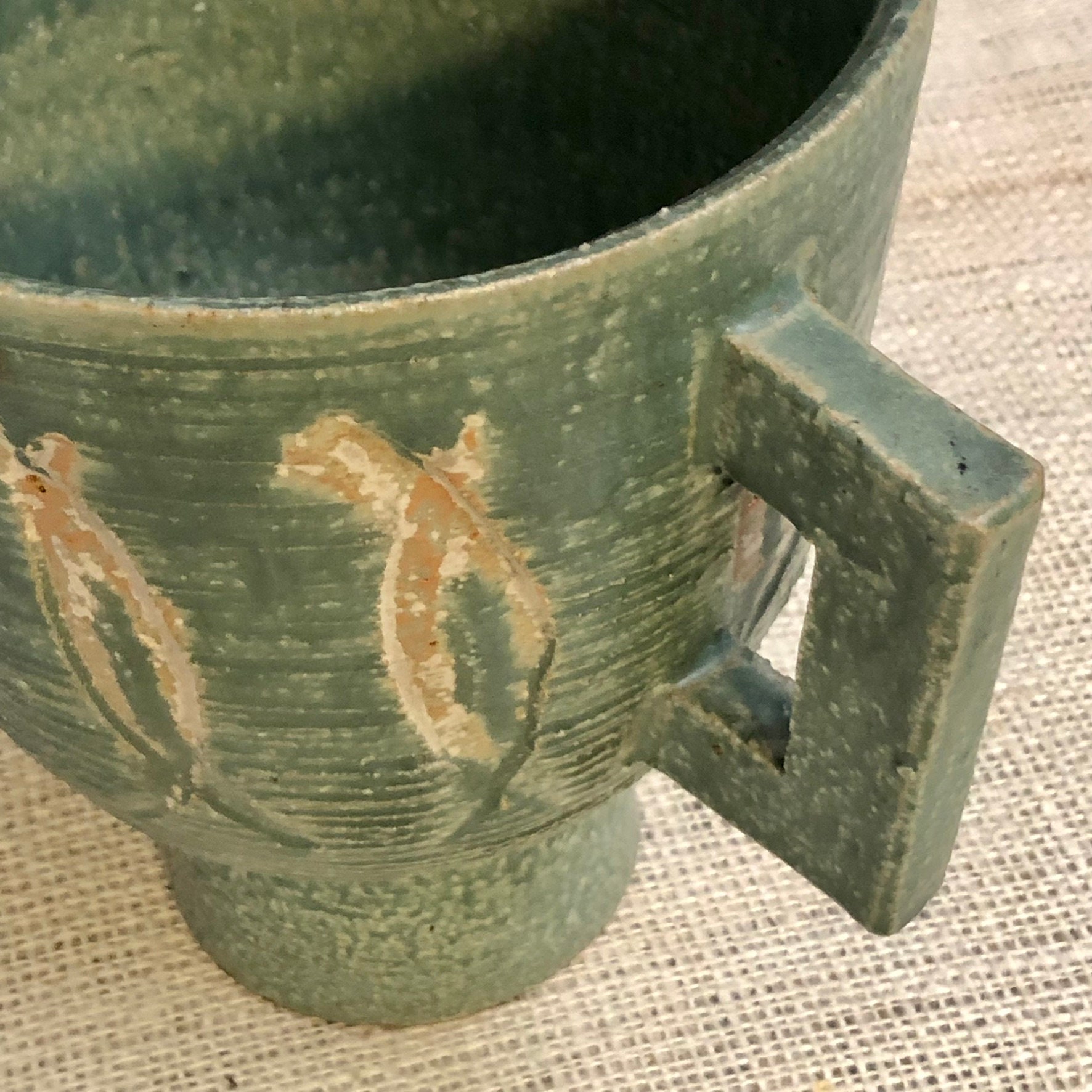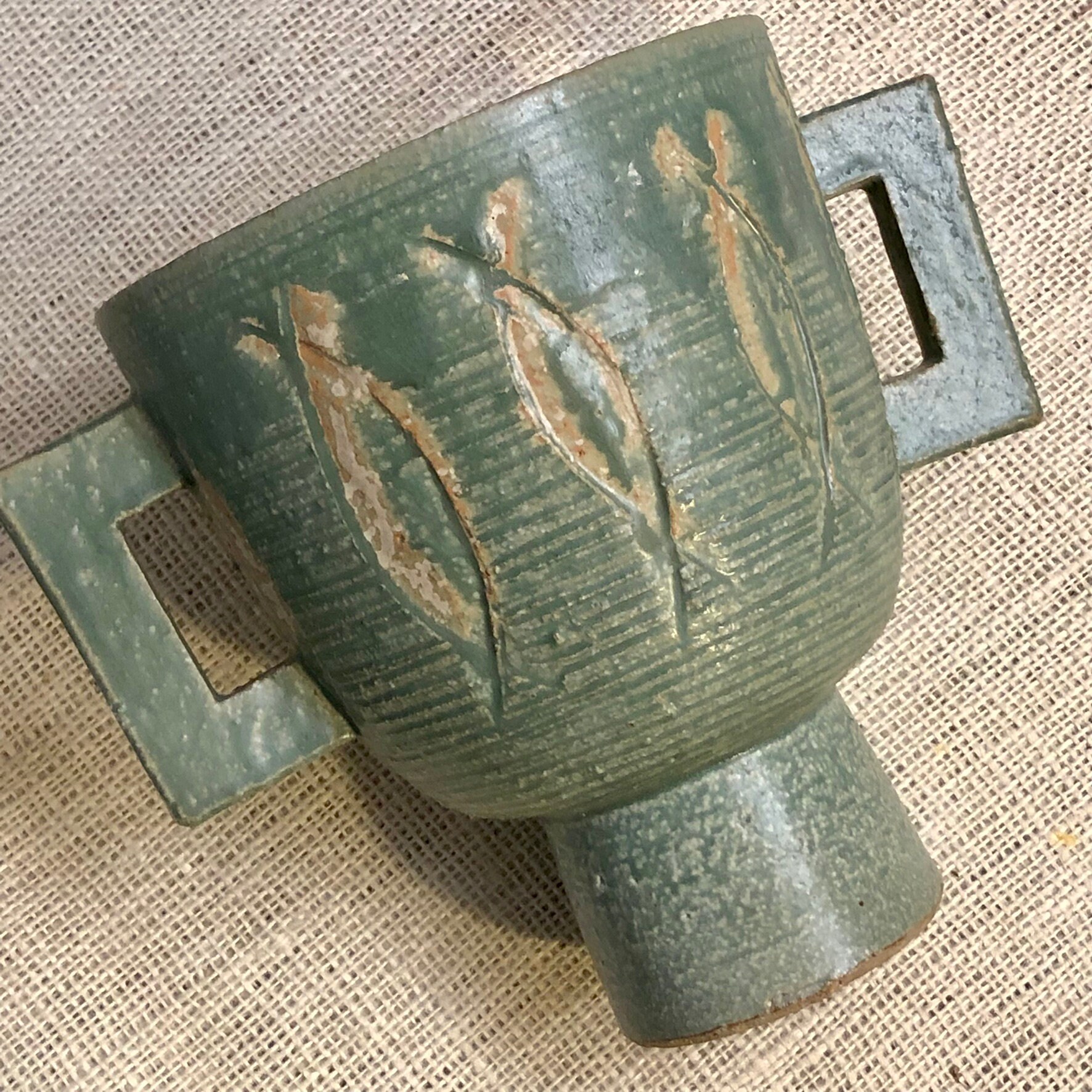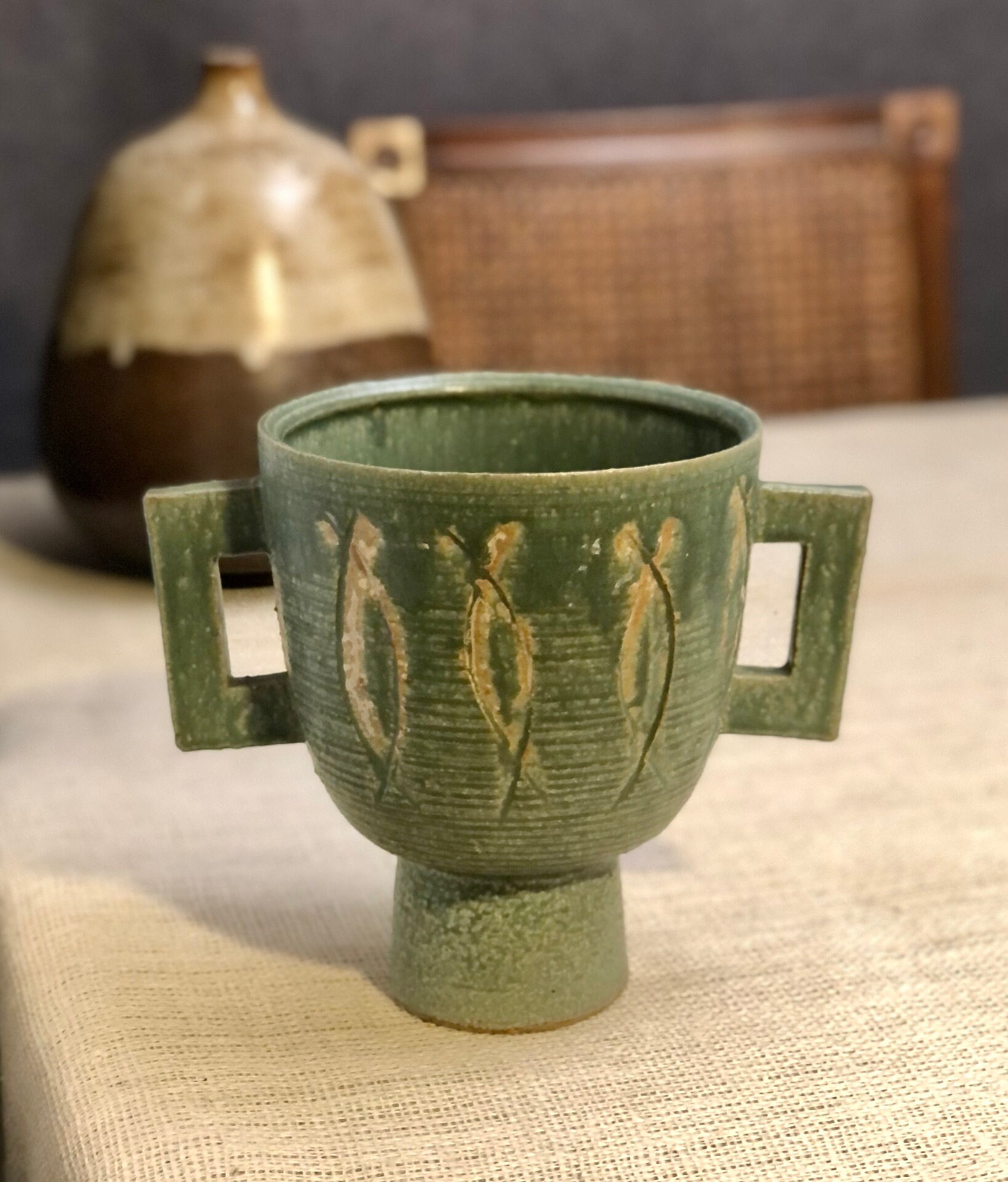 Vintage 1960’s Toyo Ikebana Pottery Chalice Cup with Pedestal Base and Two Handles.