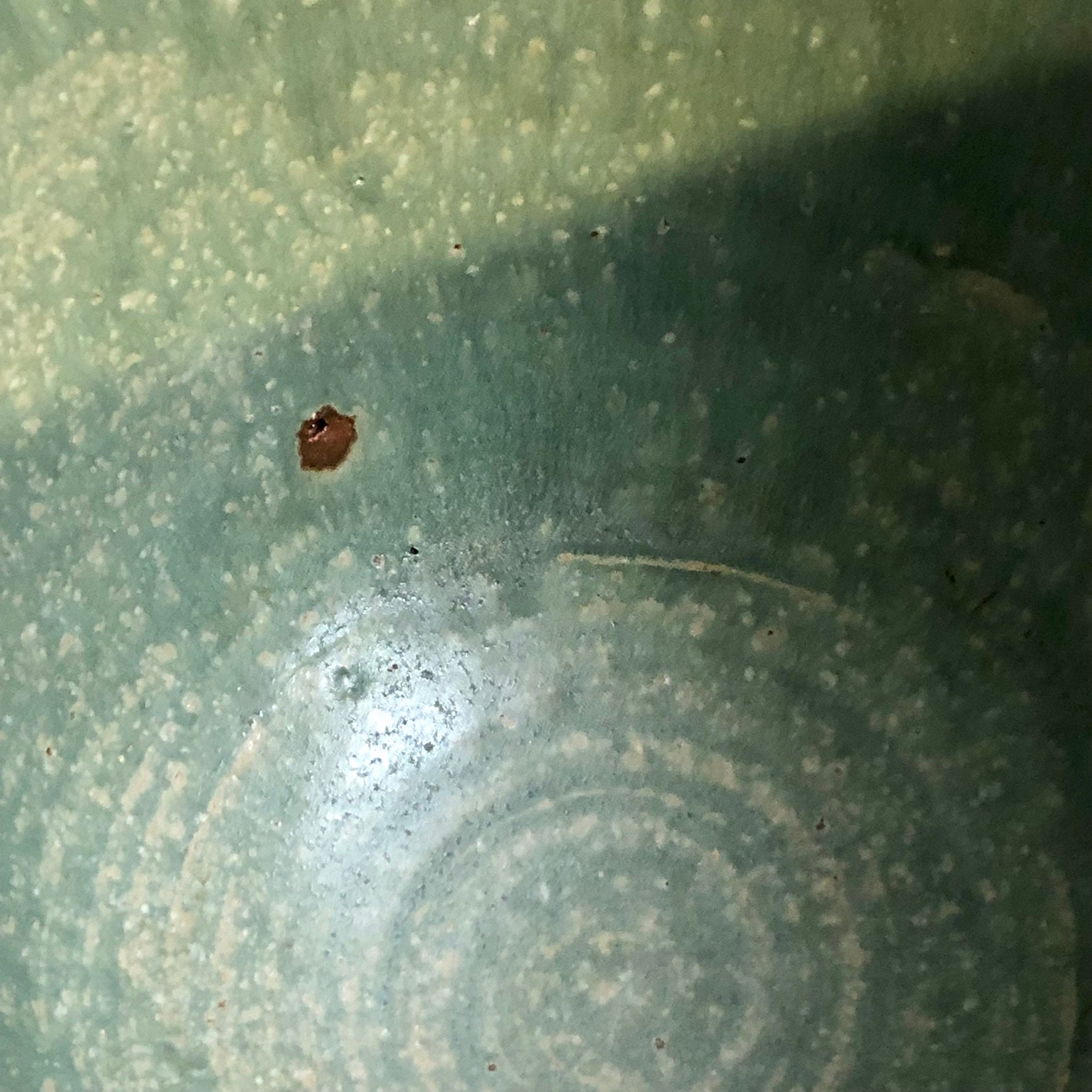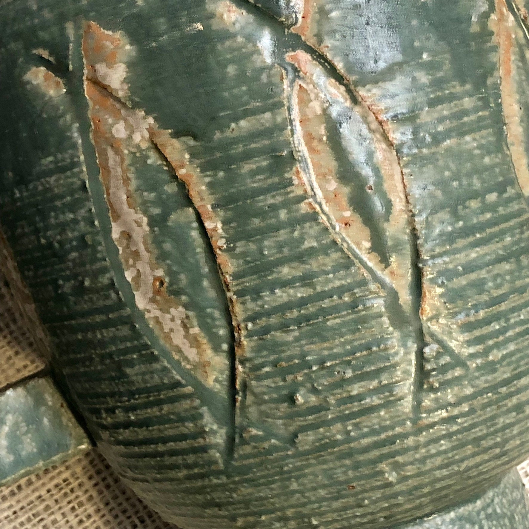 Beautiful Sage Green Textured Pottery with Vertical Fish like pattern around the perimeter of the cup.