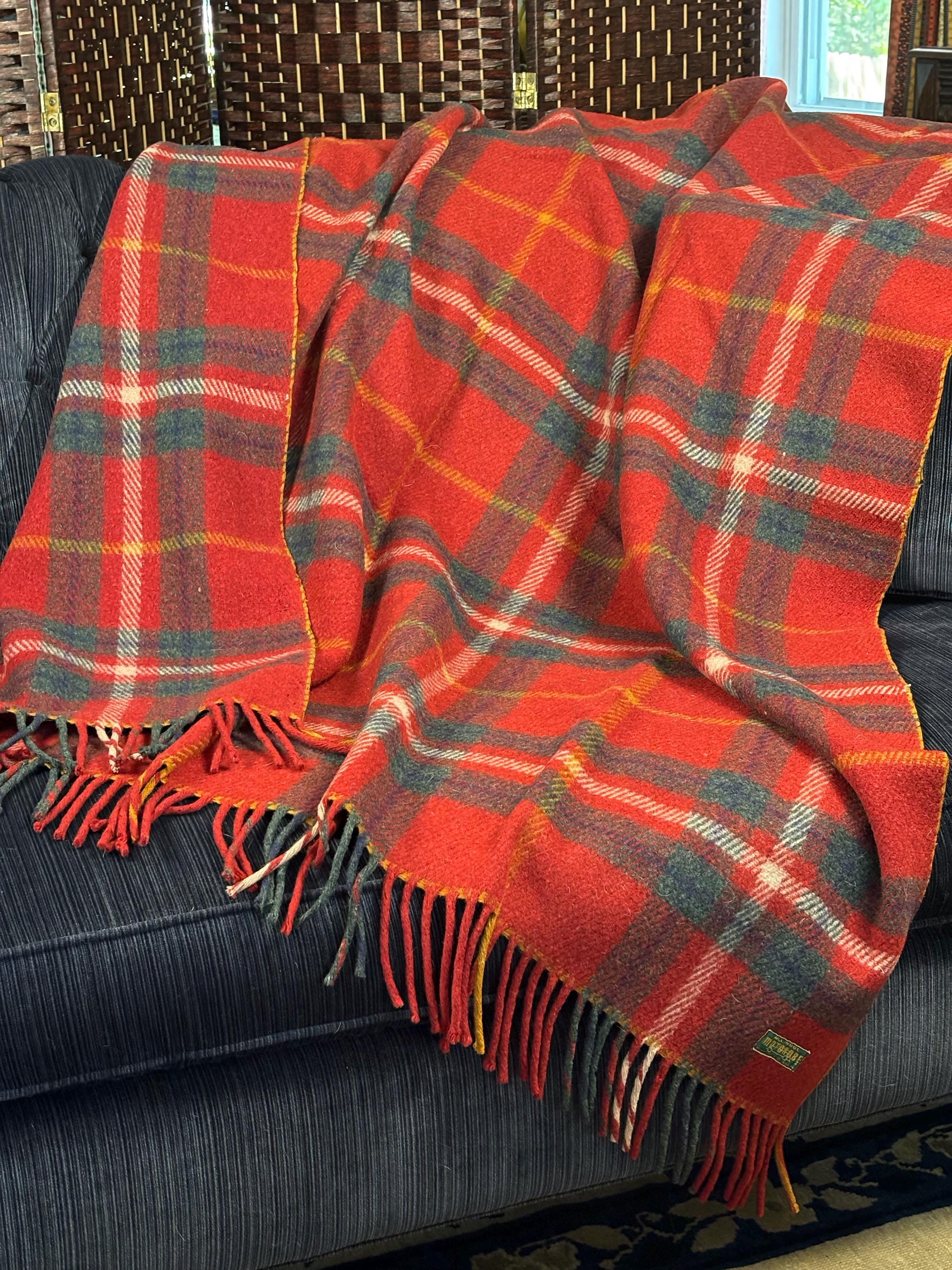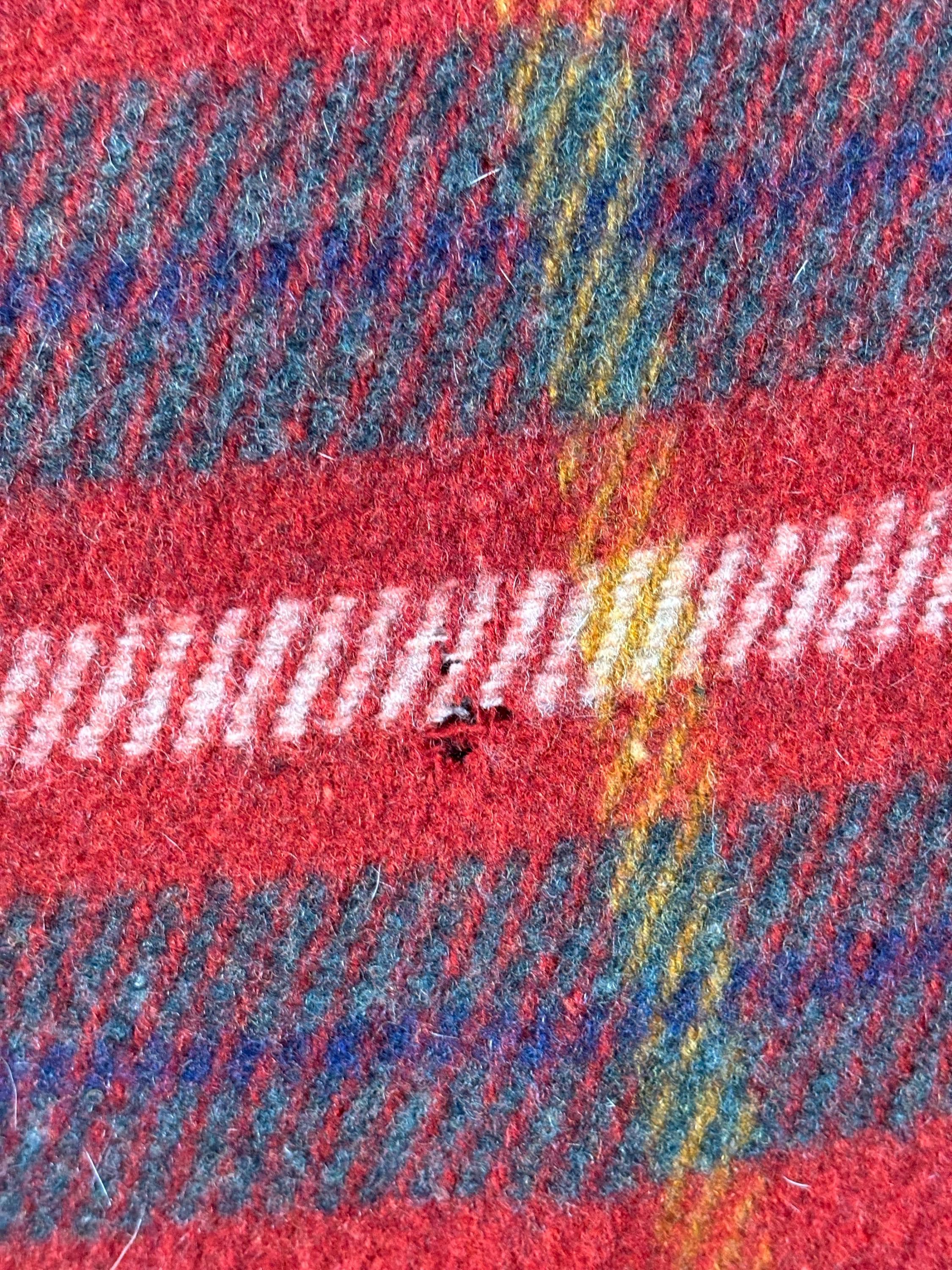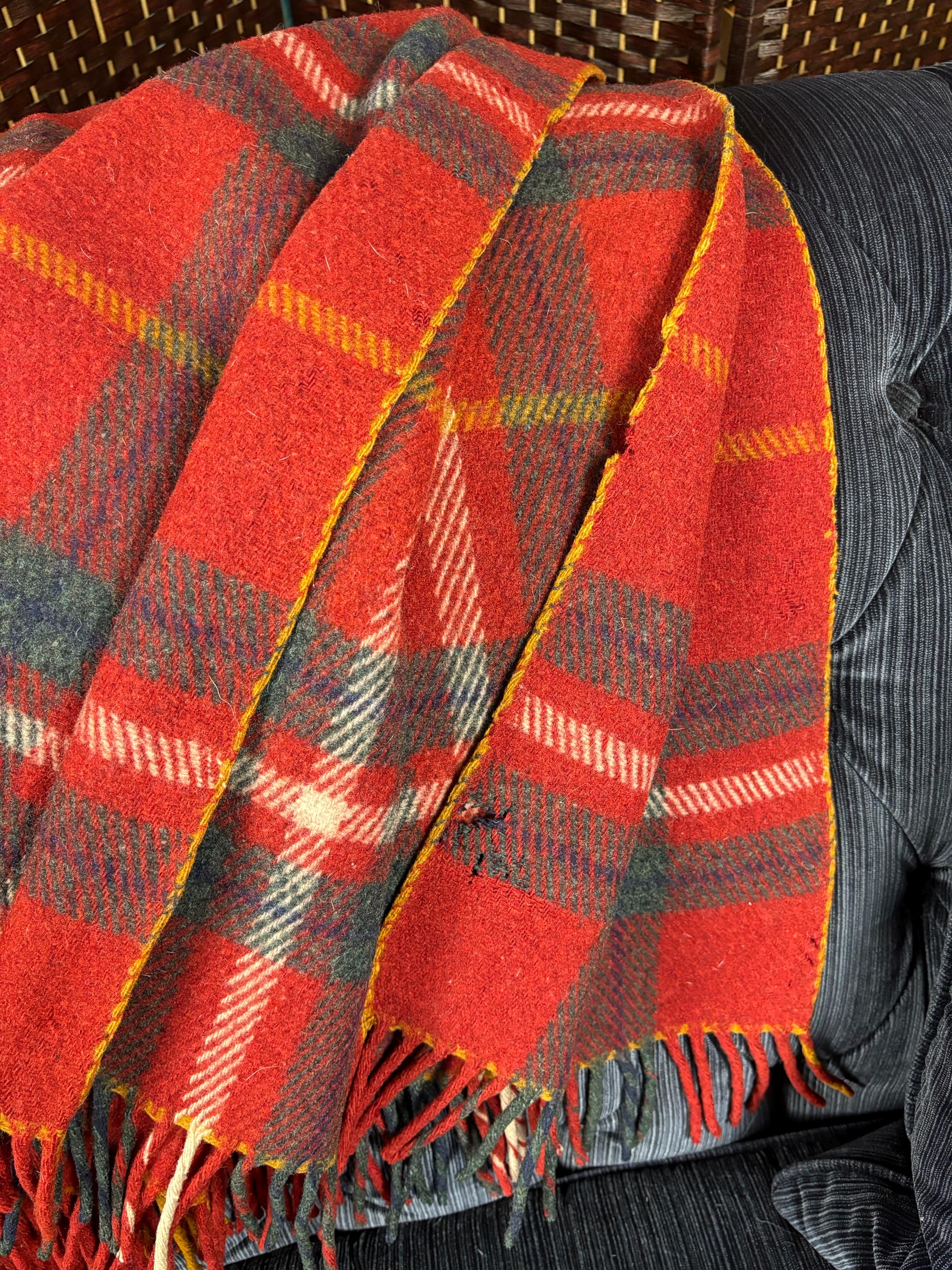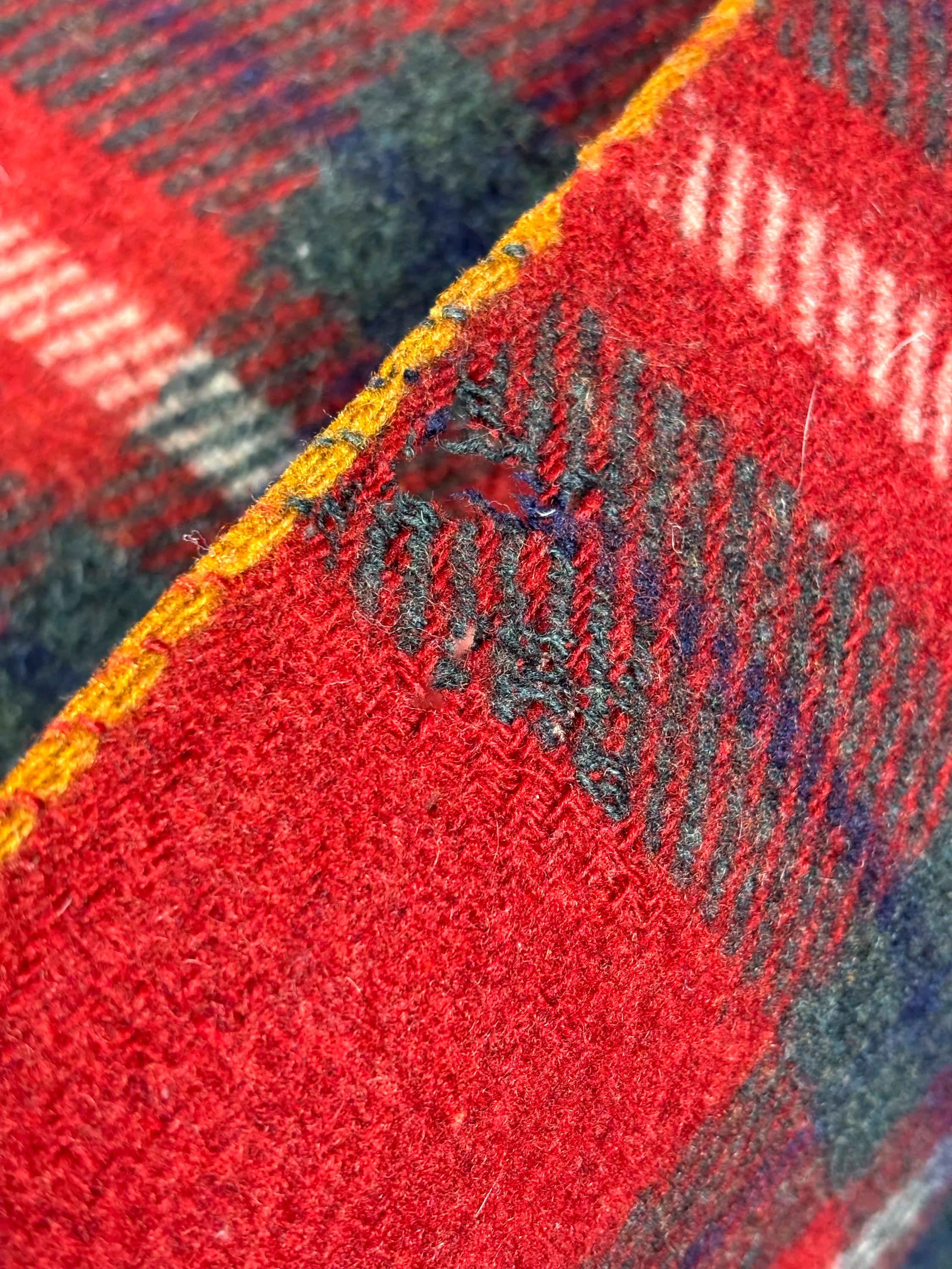 Nice Heavy 100% Wool lancet in shades of Deep Red, Charcoal Gray, White And Yellow. Made in the 1940’s and in Vintage Condition with some holes around the edges of the blanket. The first two Photos taken are more color correct.