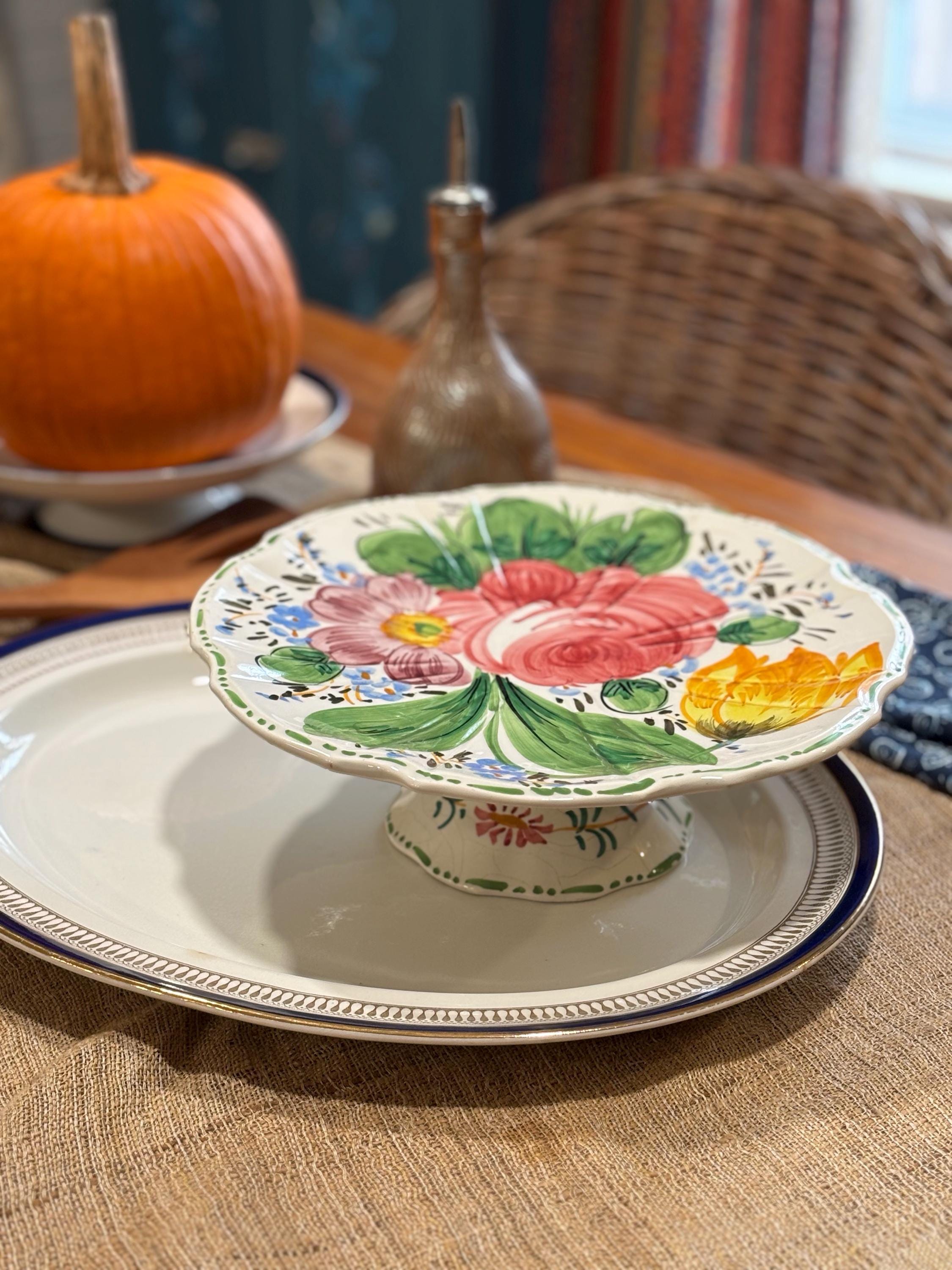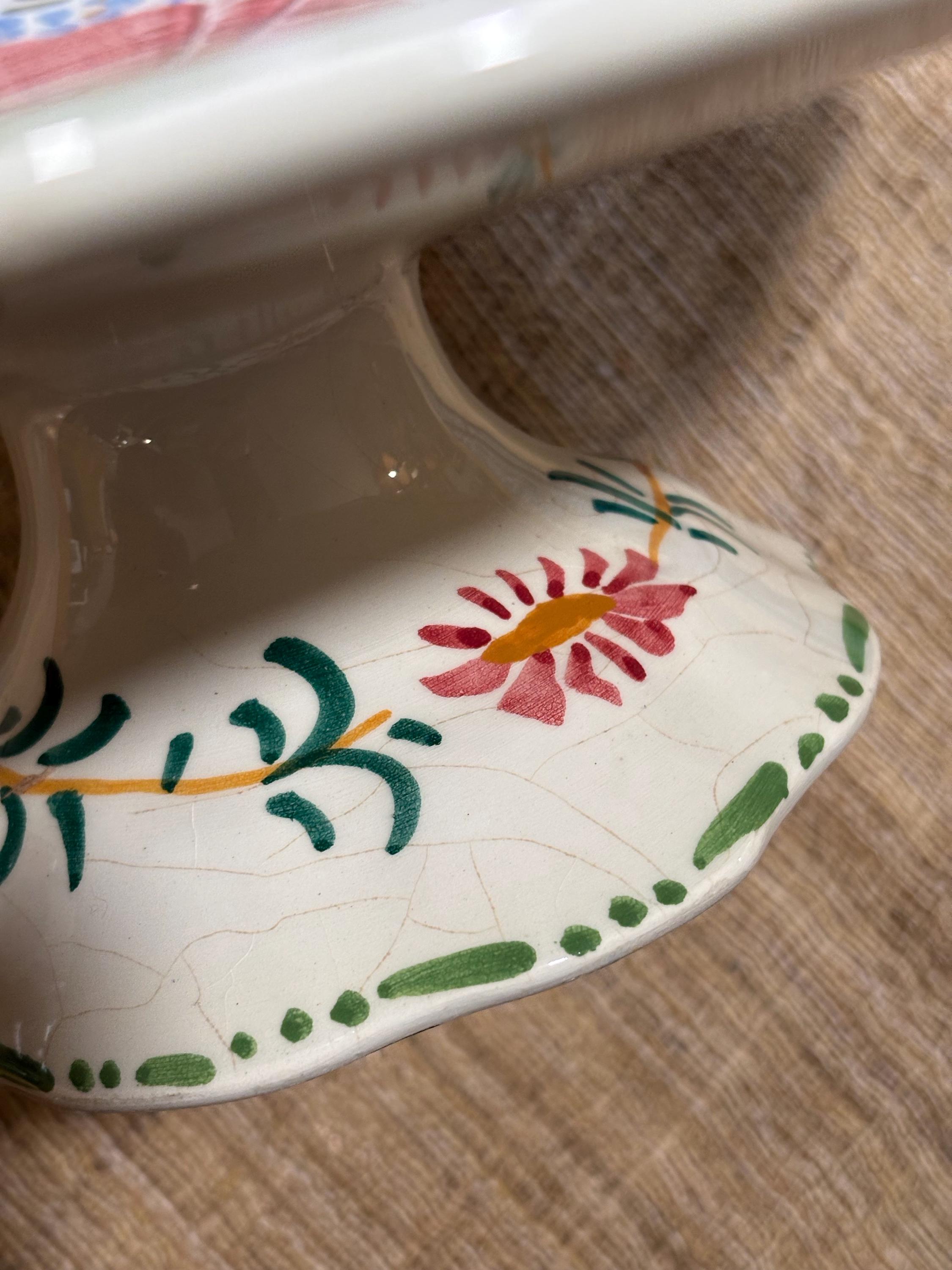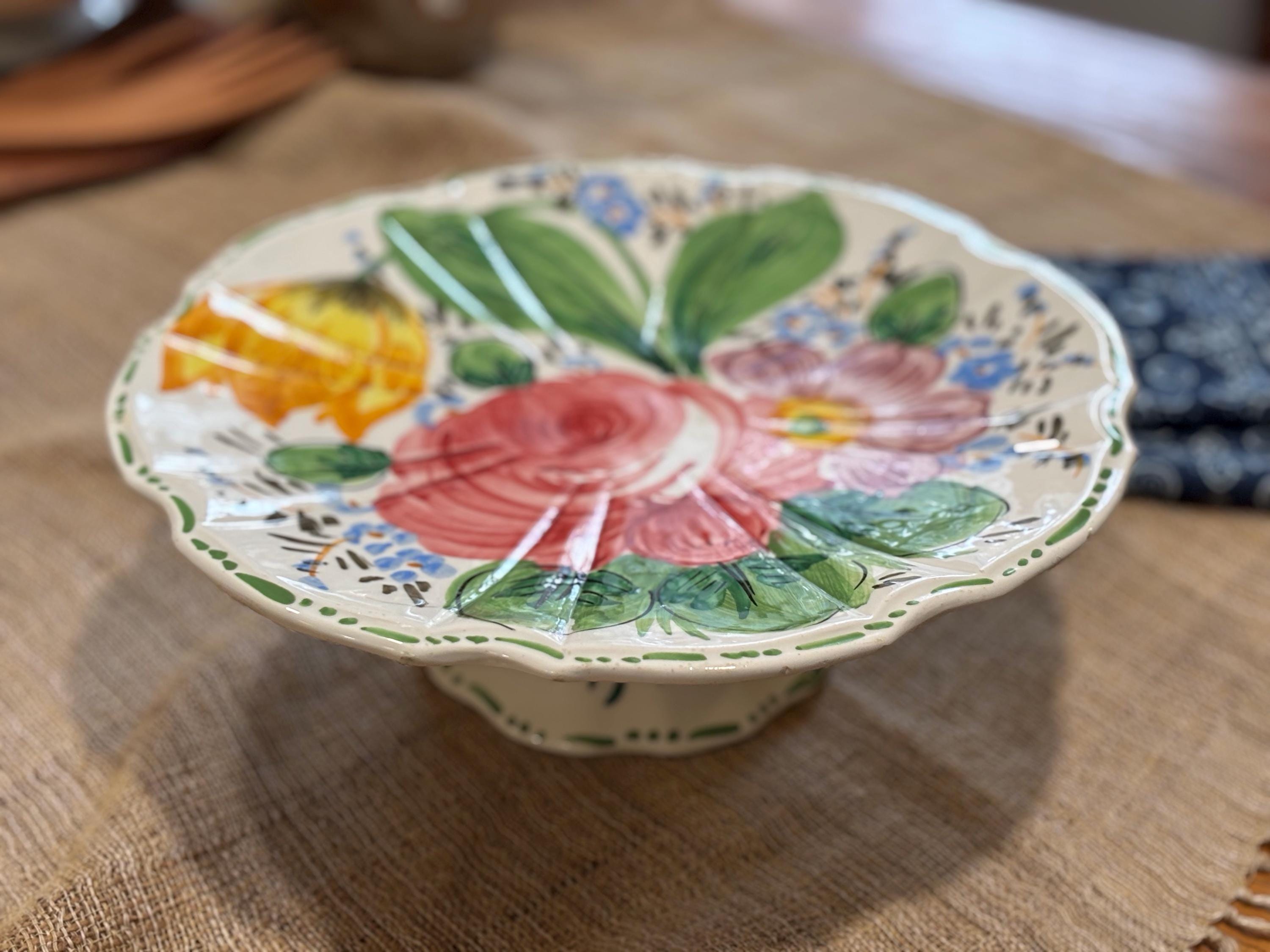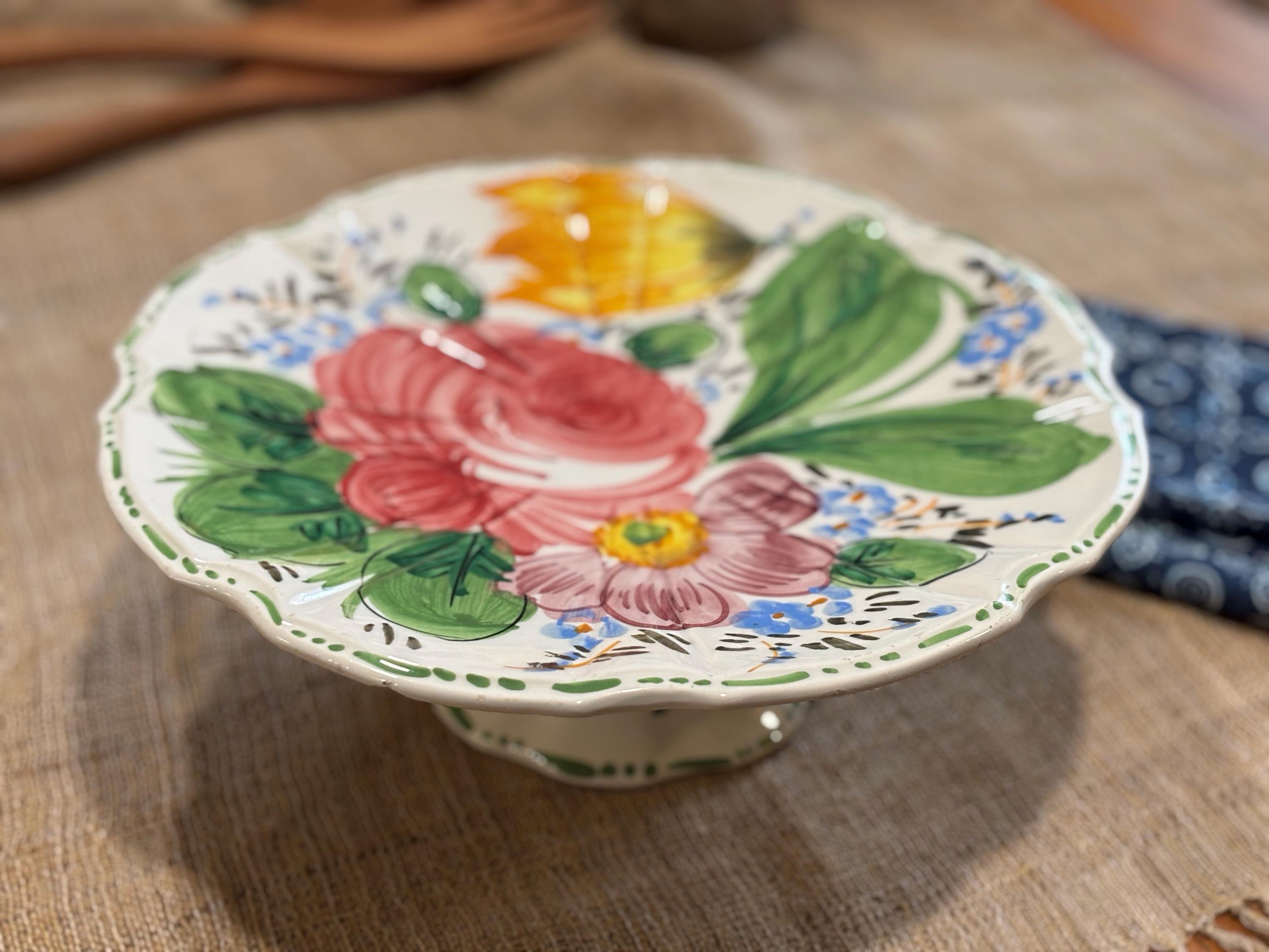 Vintage Italian Folk Art/Majolica Ceramic Floral Cake Stand.
