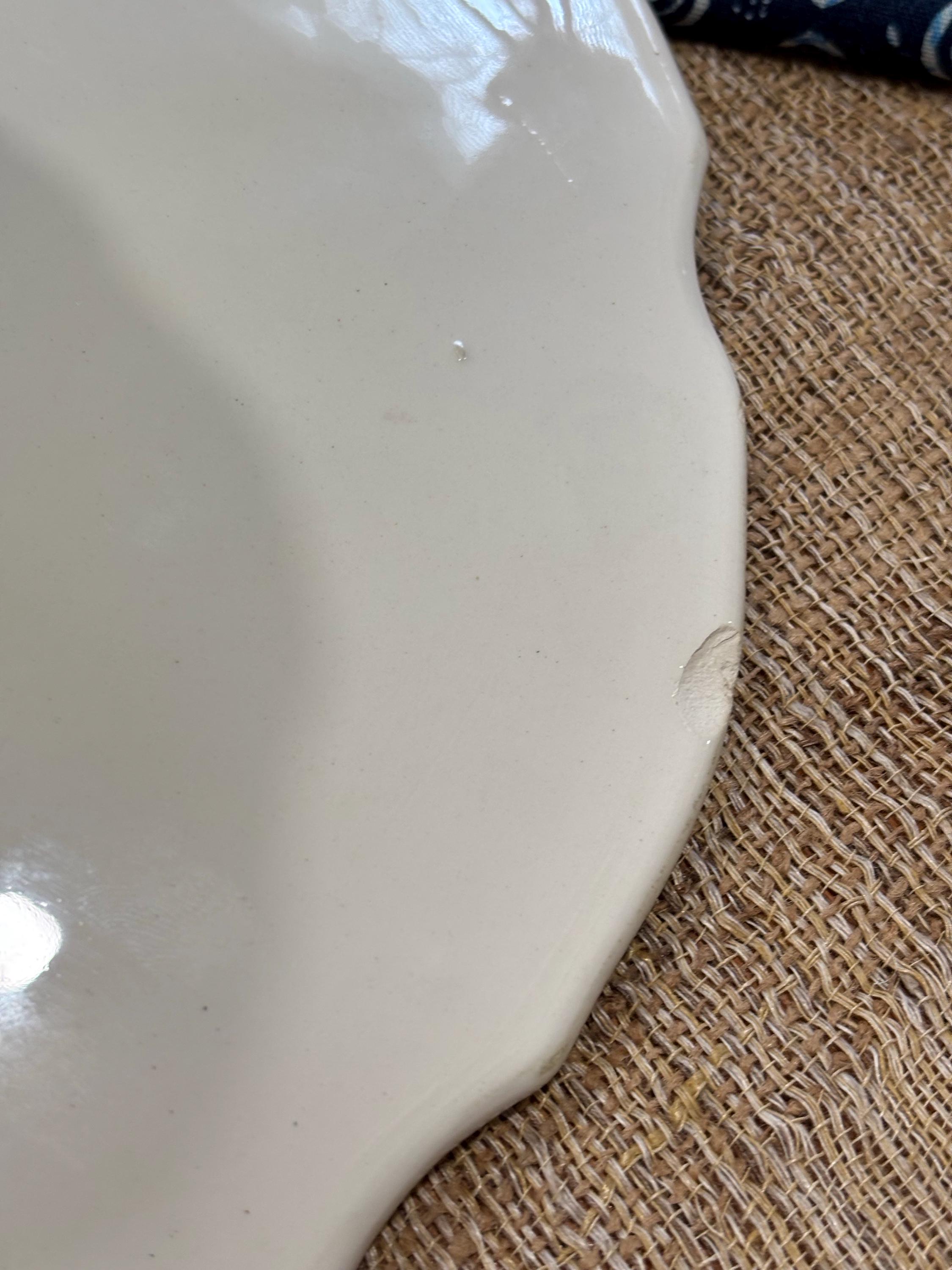 11” inches in diameter and 3.75”” inches tall. With one chip under the Rim and some crazing in the glaze on the Stand Base. See images closely for Details.