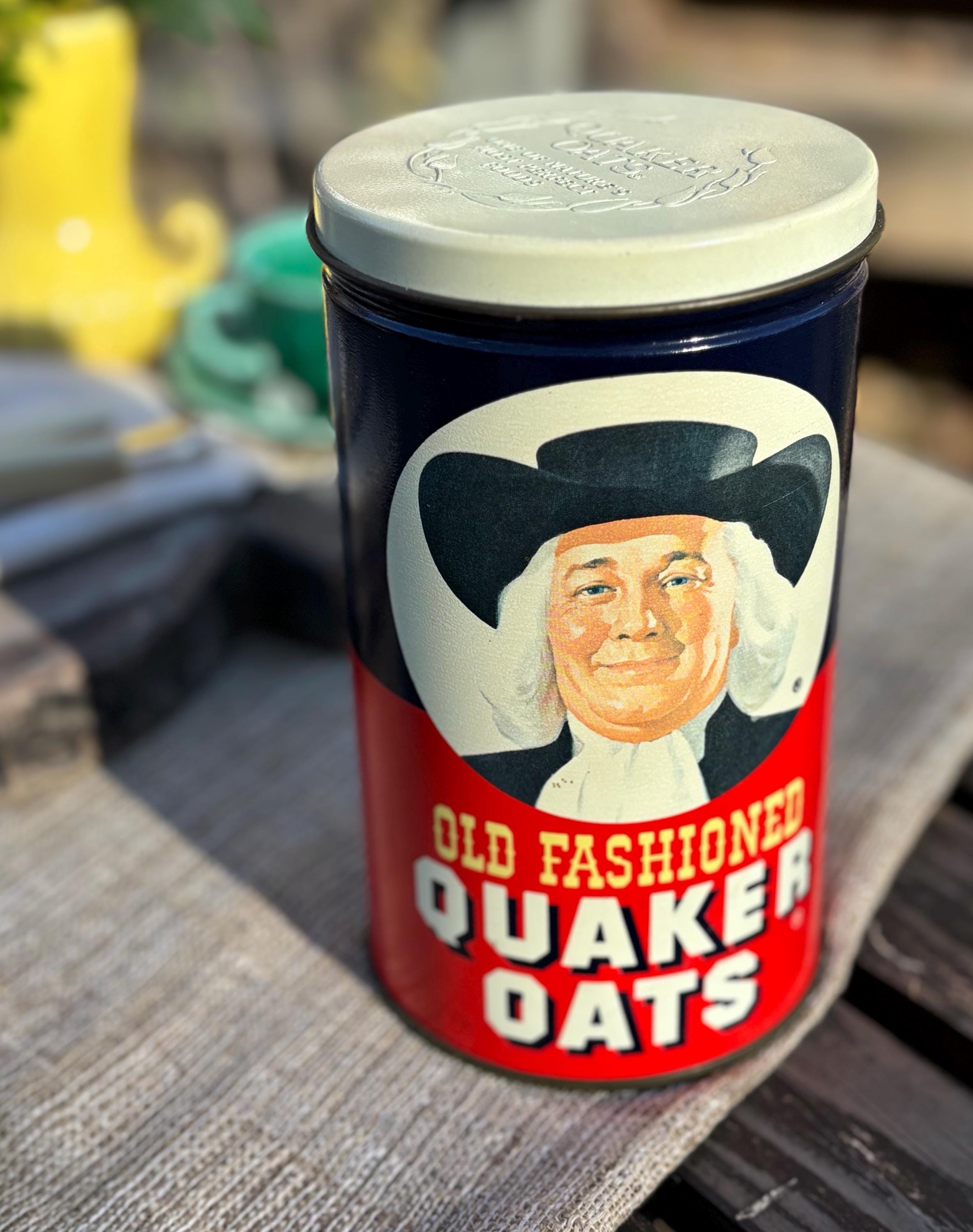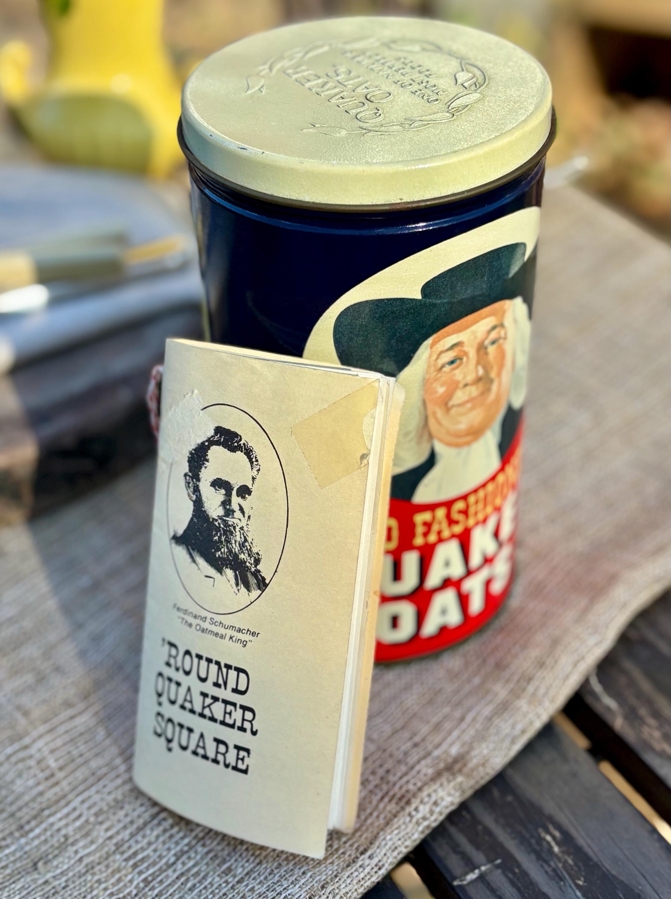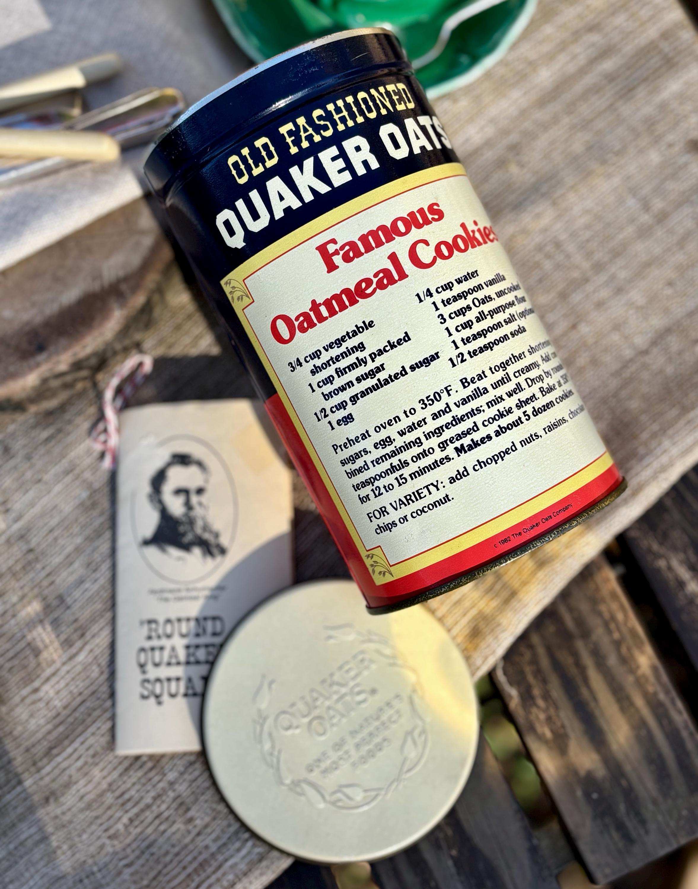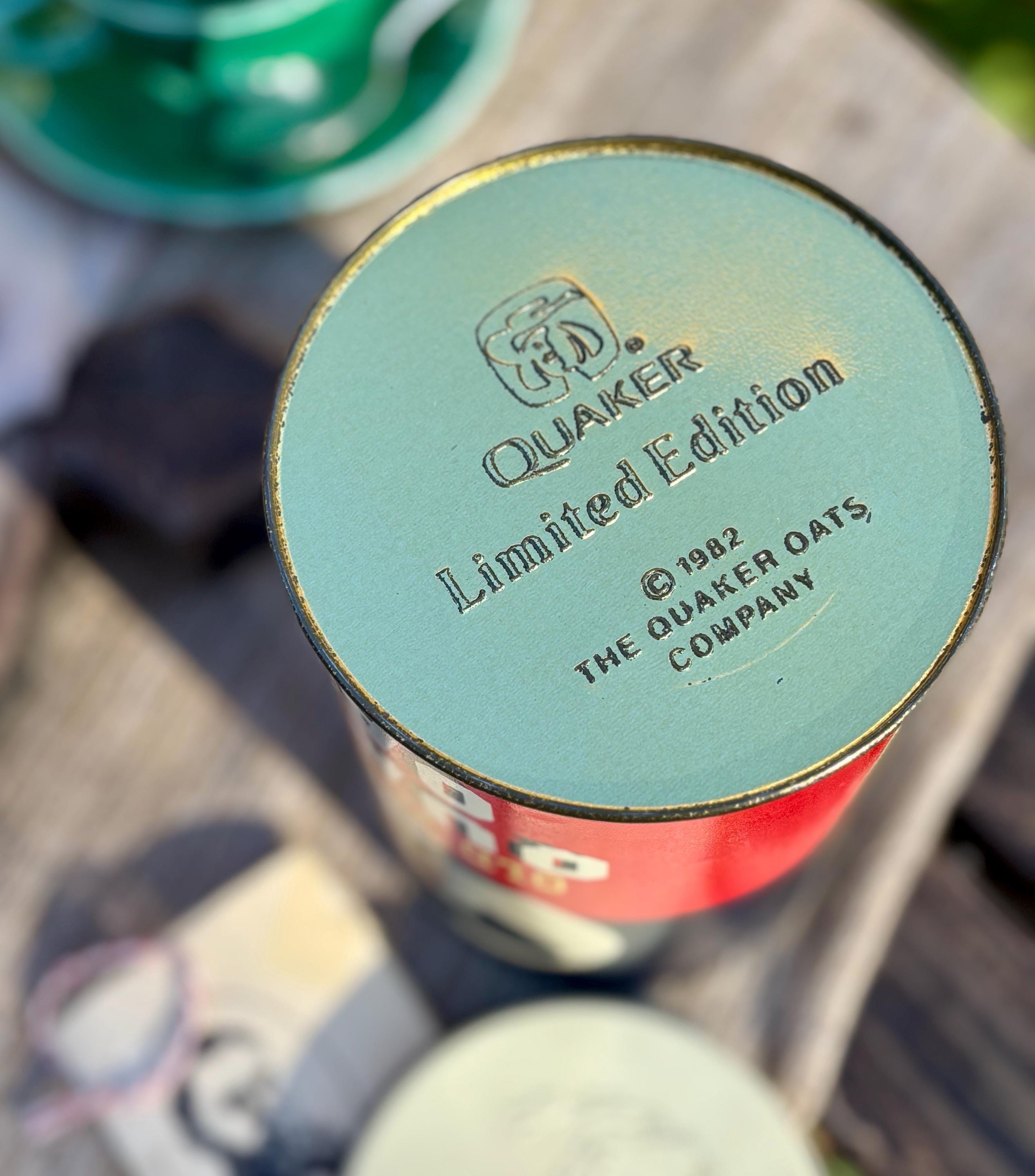 Vintage 1982 Quaker Oats Advertising Tin with Little Booklet on History of Quaker Oats. Good Vintage Condition 7.5”inches tall and 4” inches in diameter.