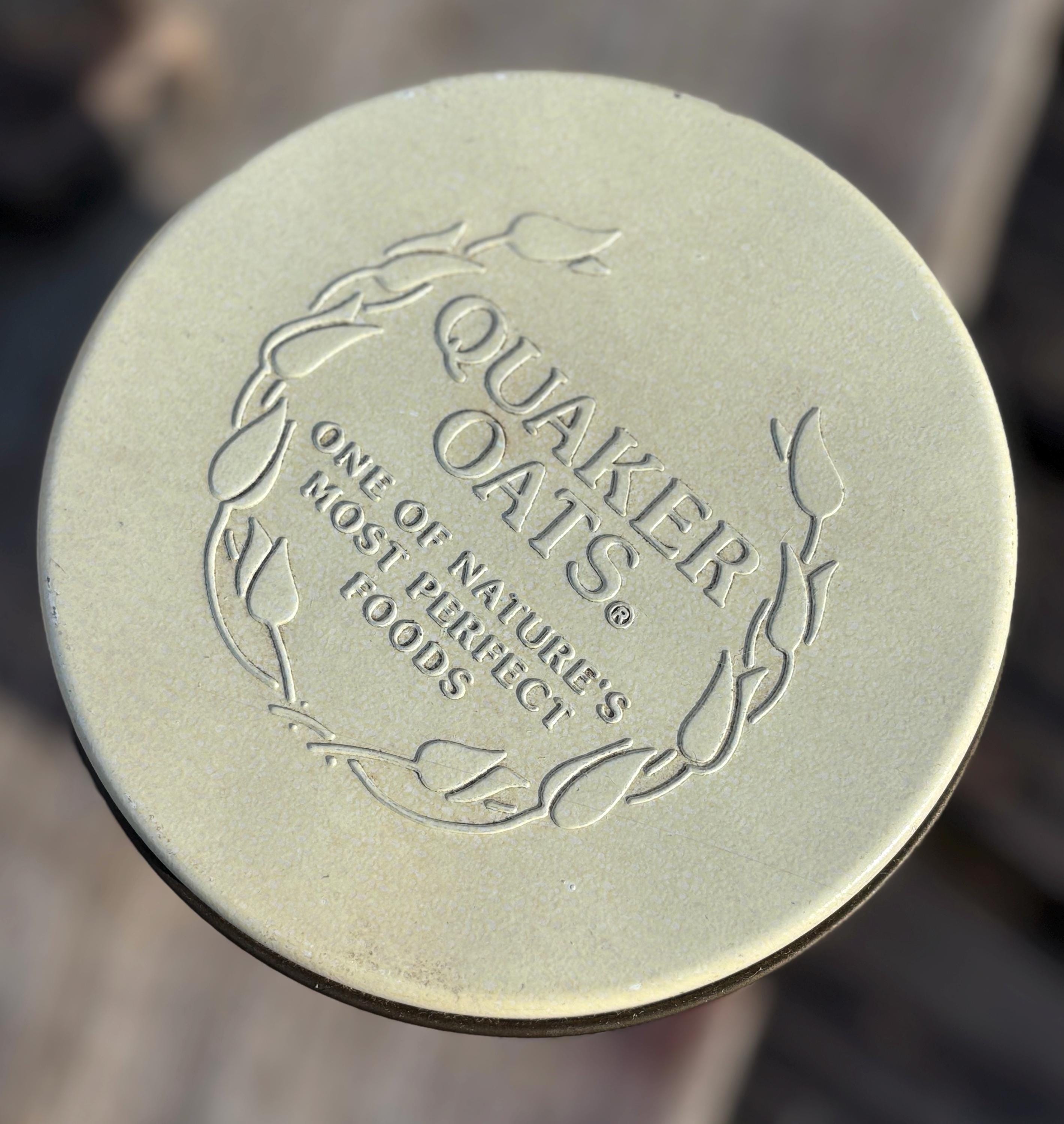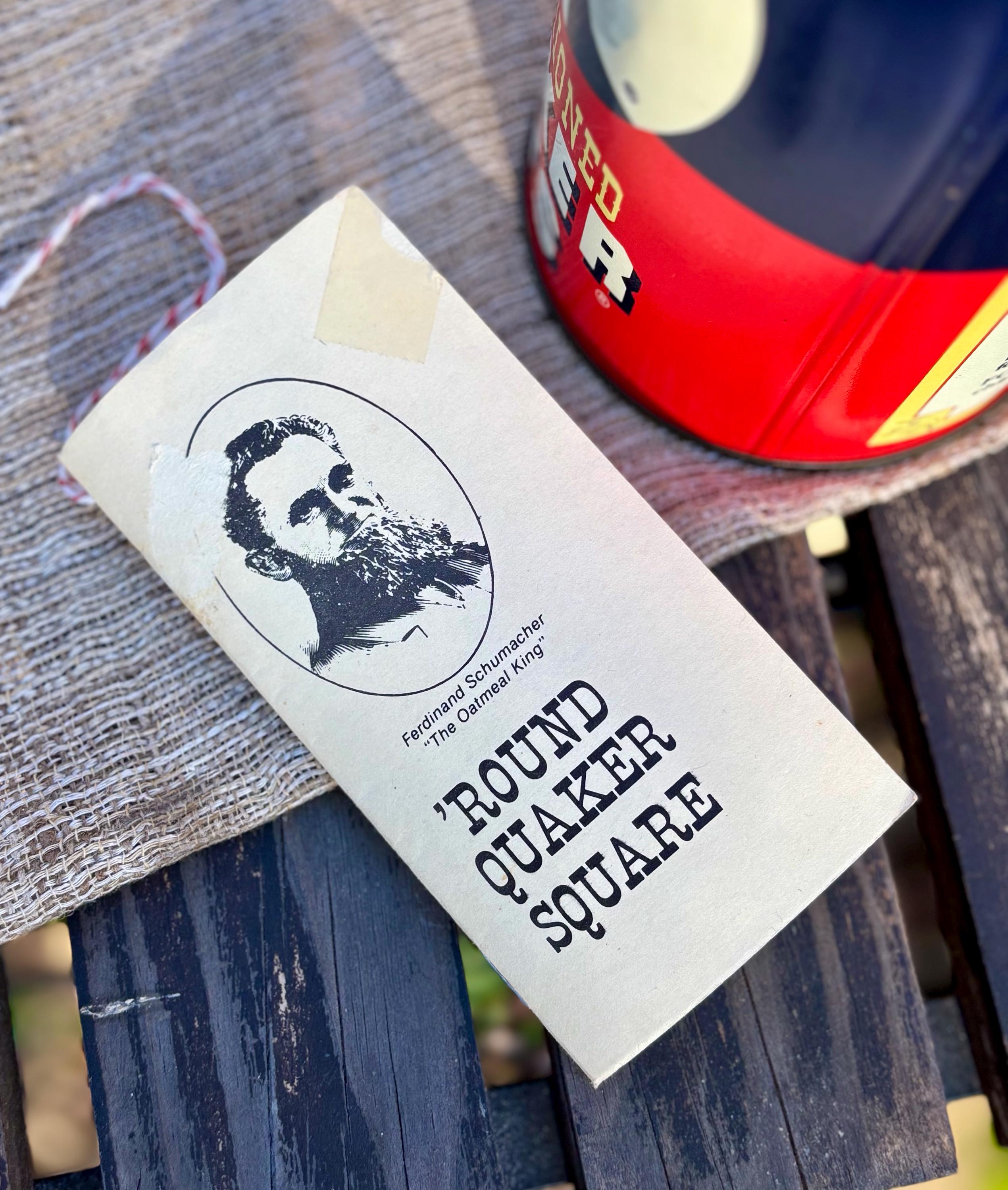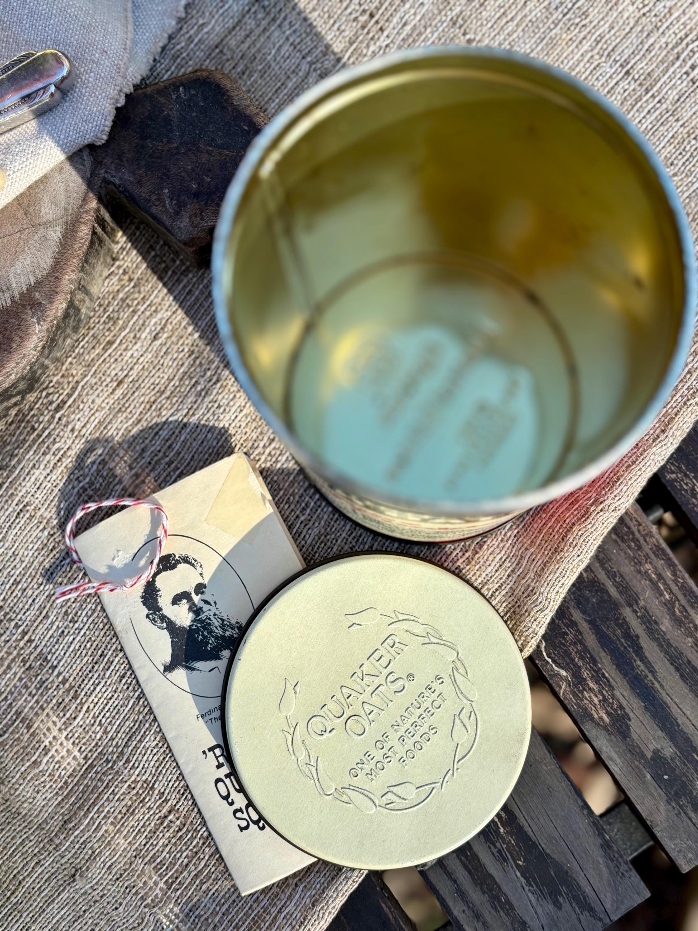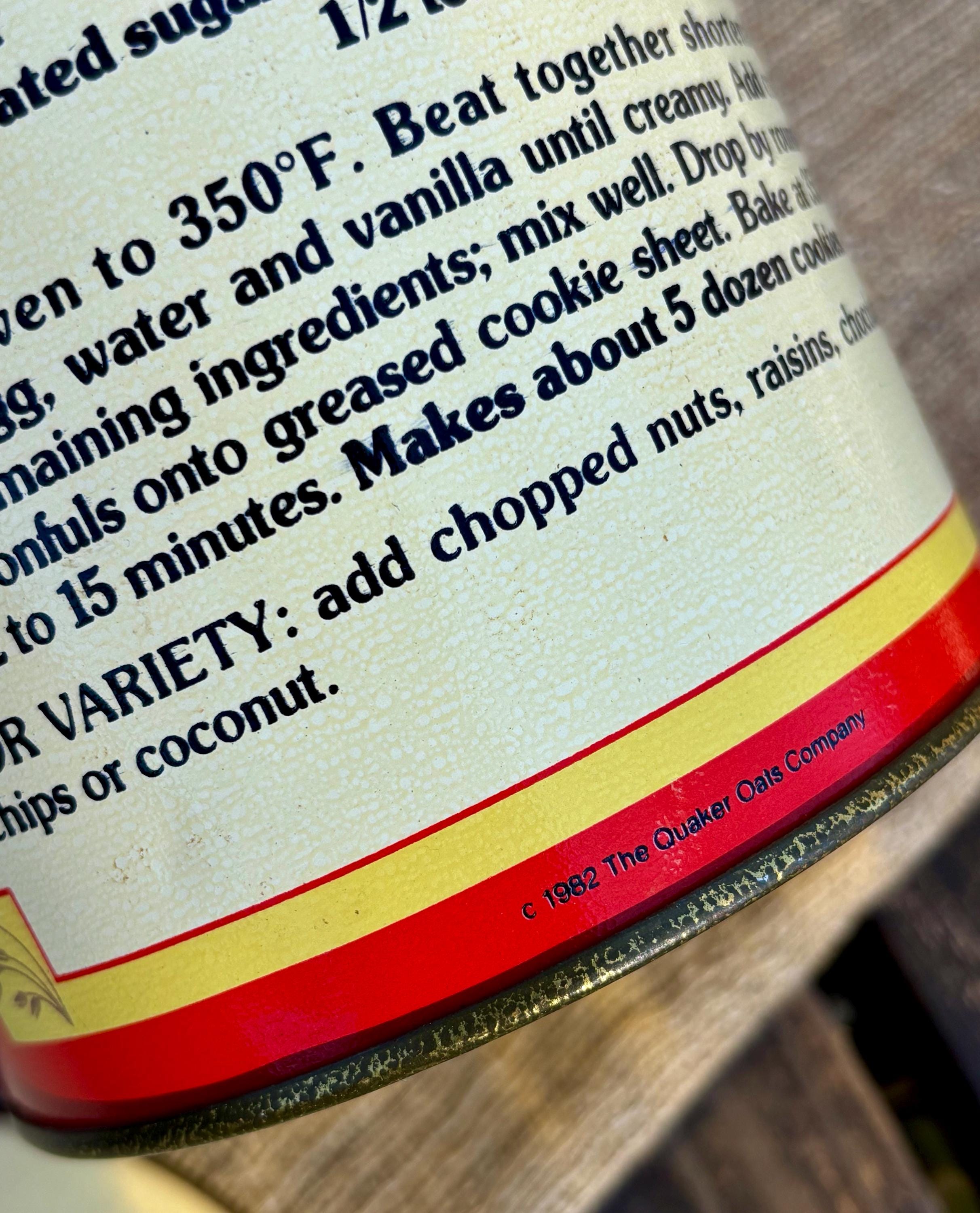 Vintage 1982 Quaker Oats Advertising Tin with Little Booklet on History of Quaker Oats. Good Vintage Condition 7.5”inches tall and 4” inches in diameter.
