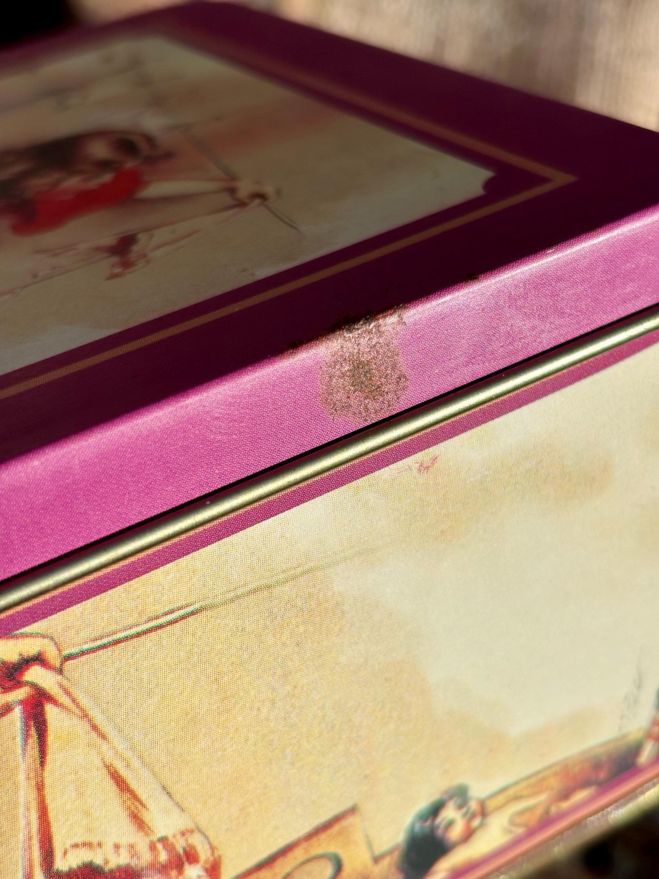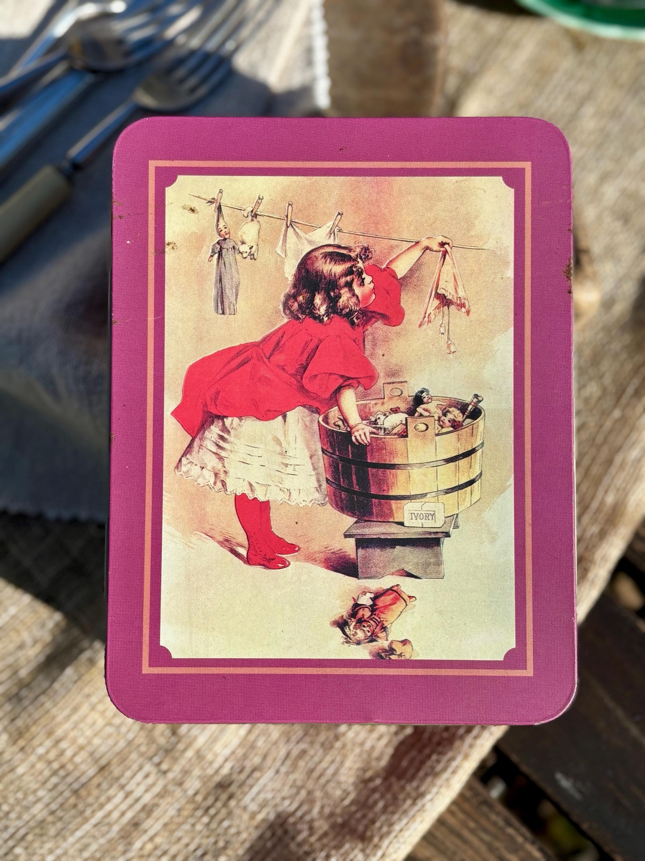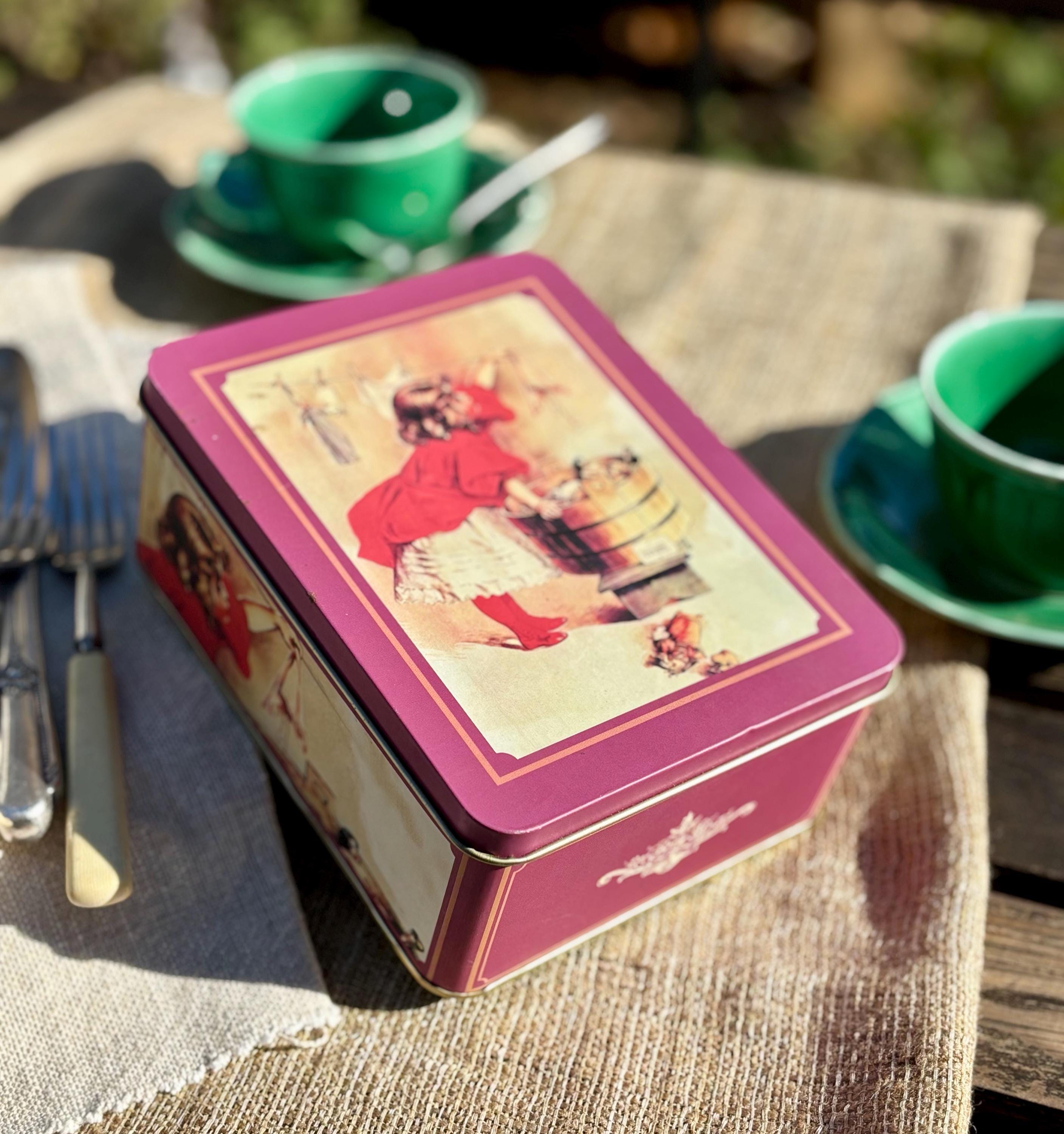 Vintage Decorative Tin Gift Box Featuring a Young Girl Doing Laundry back in the Early 1900’s. (Reproduction)