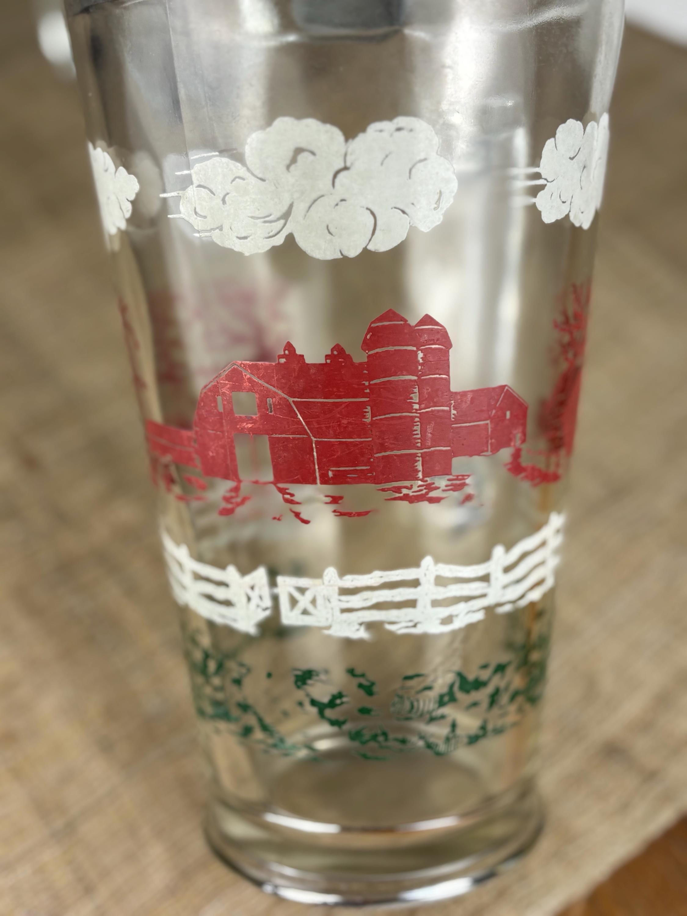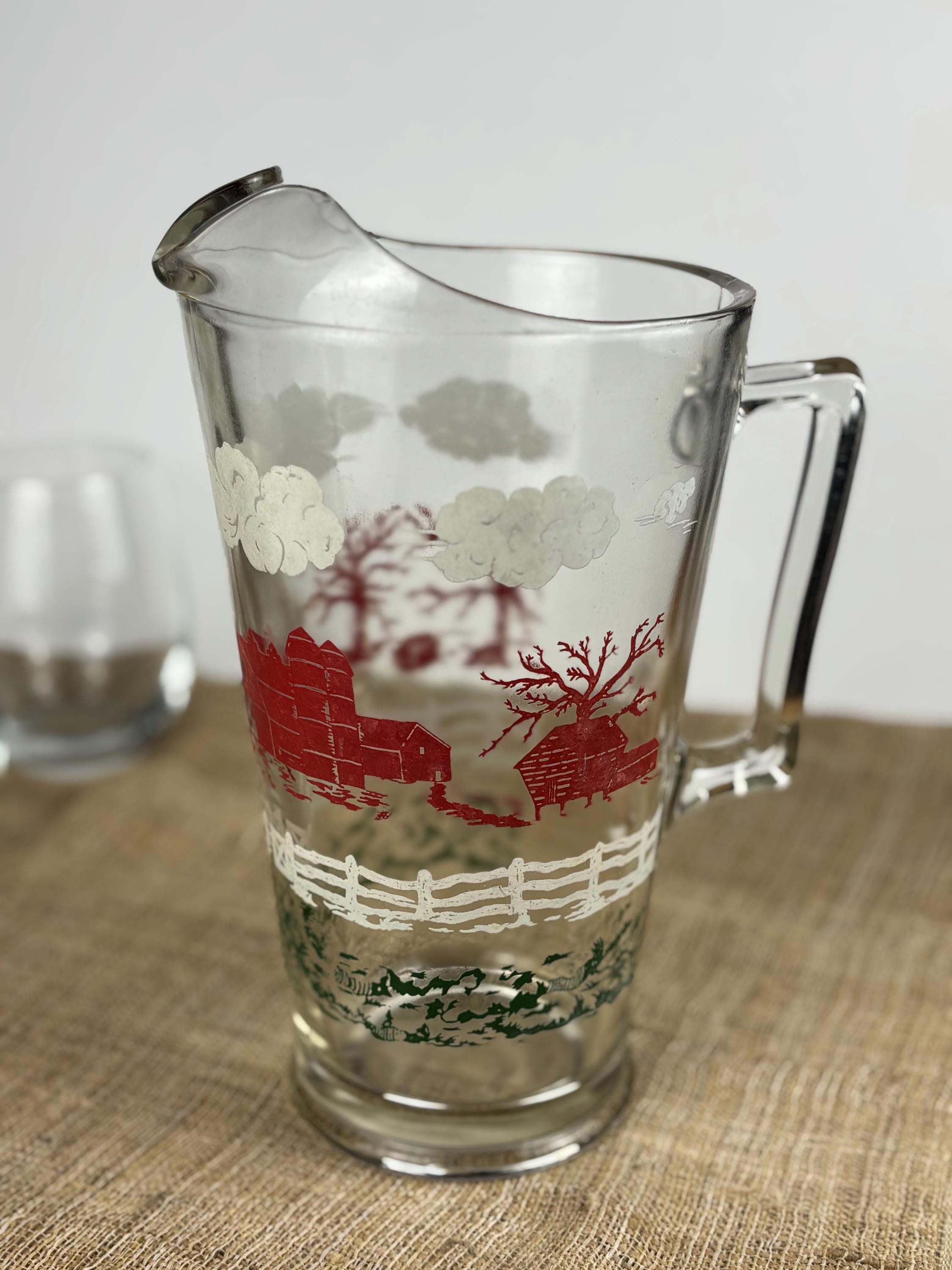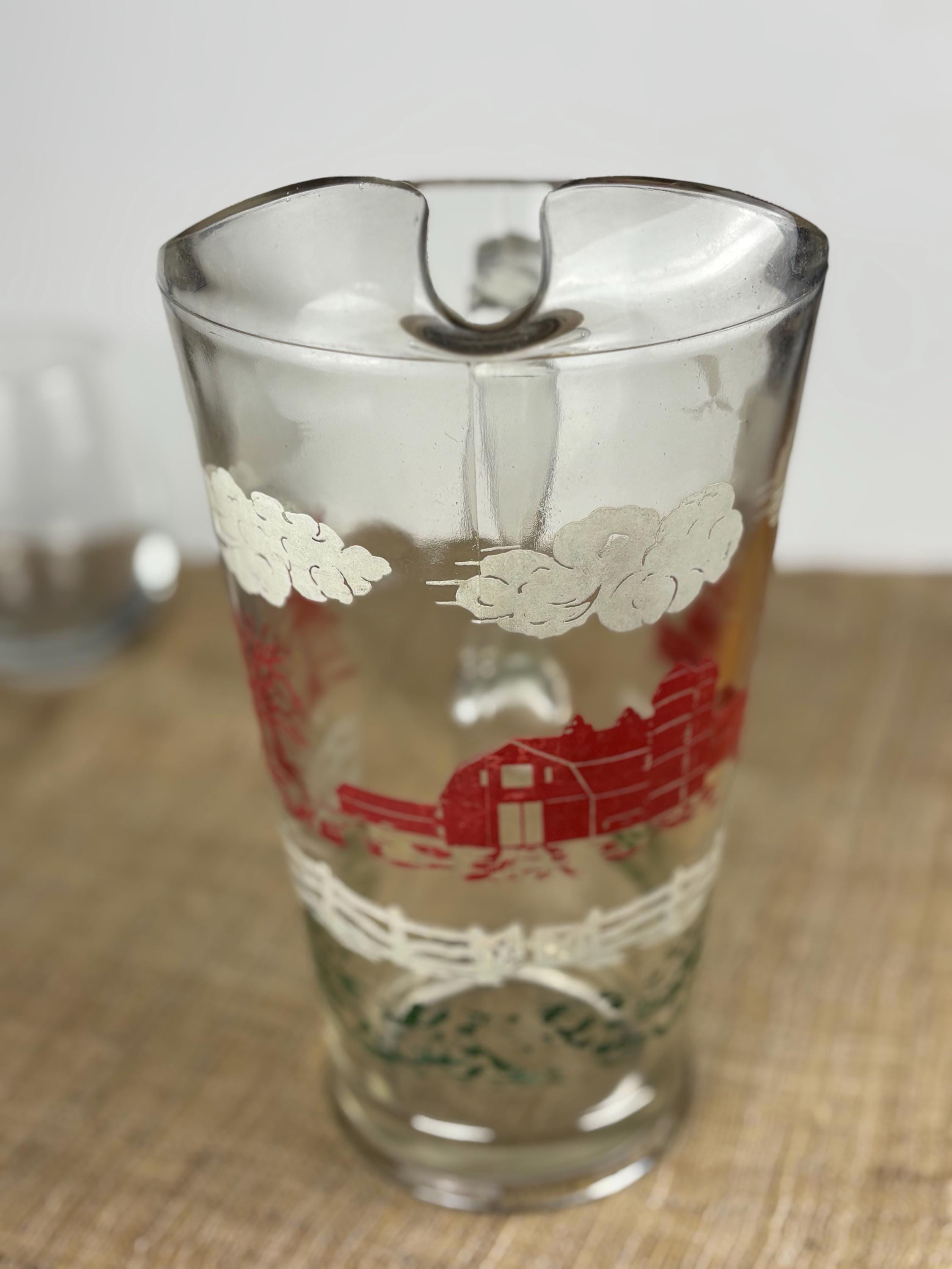 Heavy Glass Midcentury Style Pitcher with Barn Yard Farm Design.