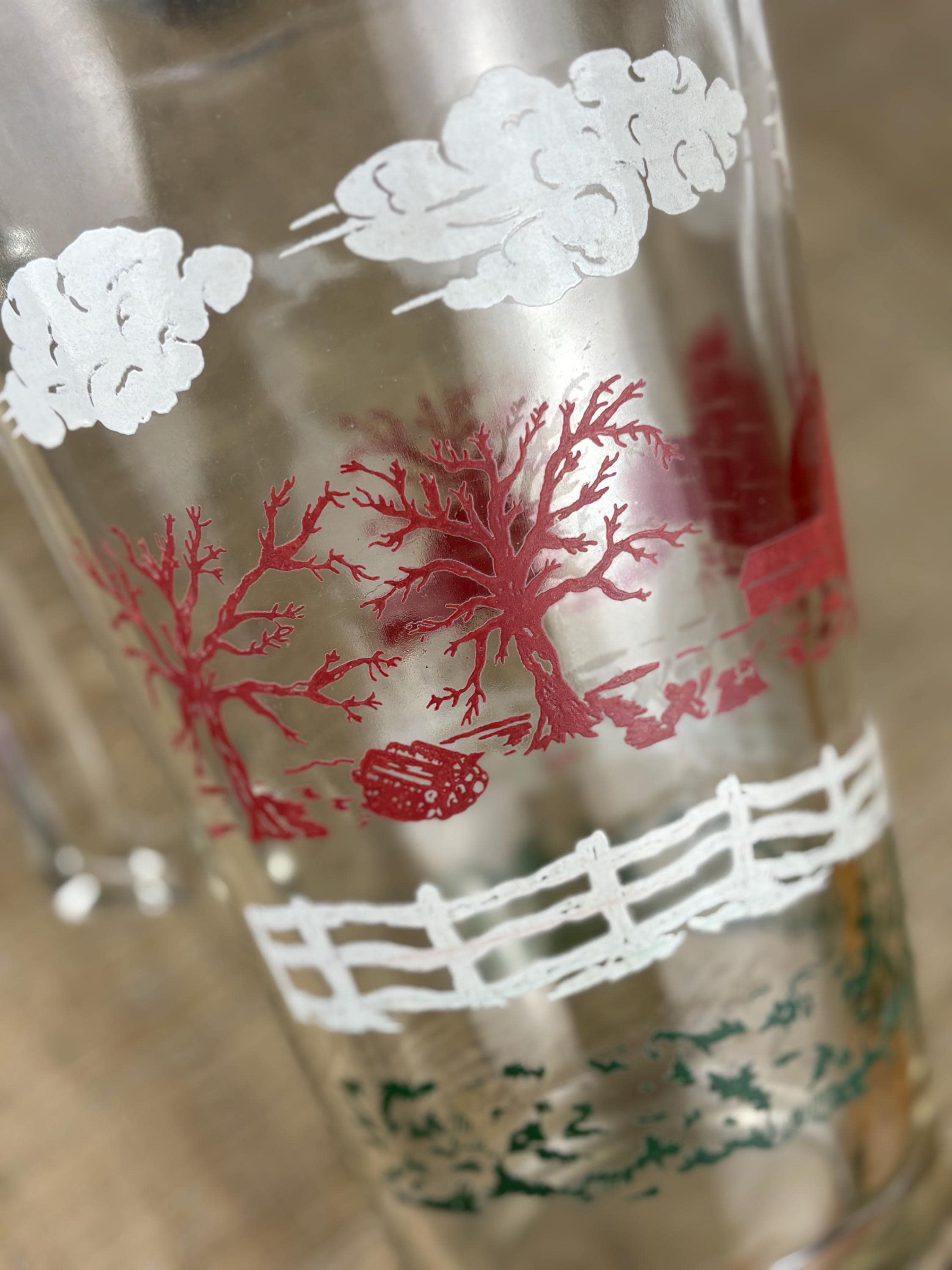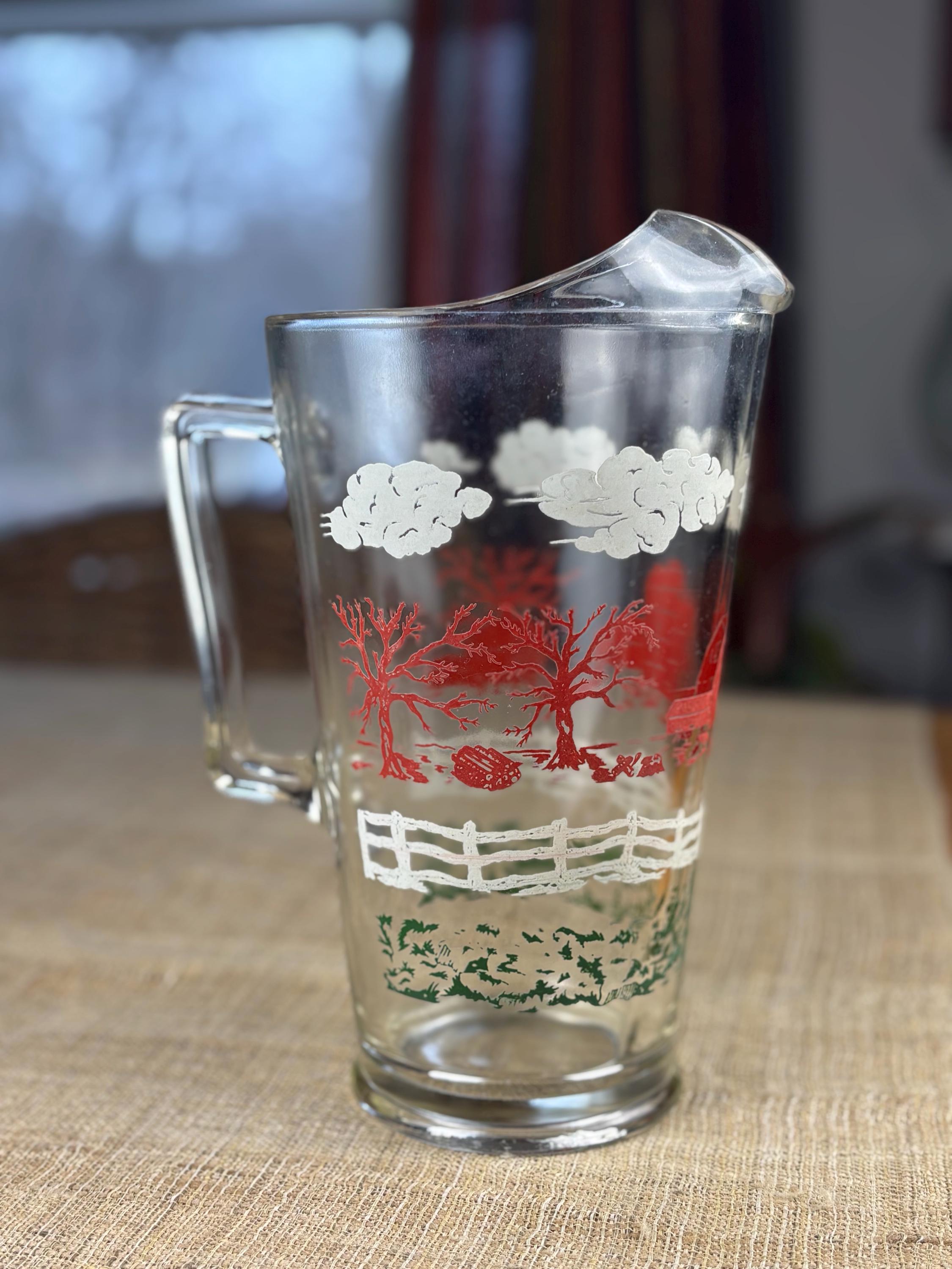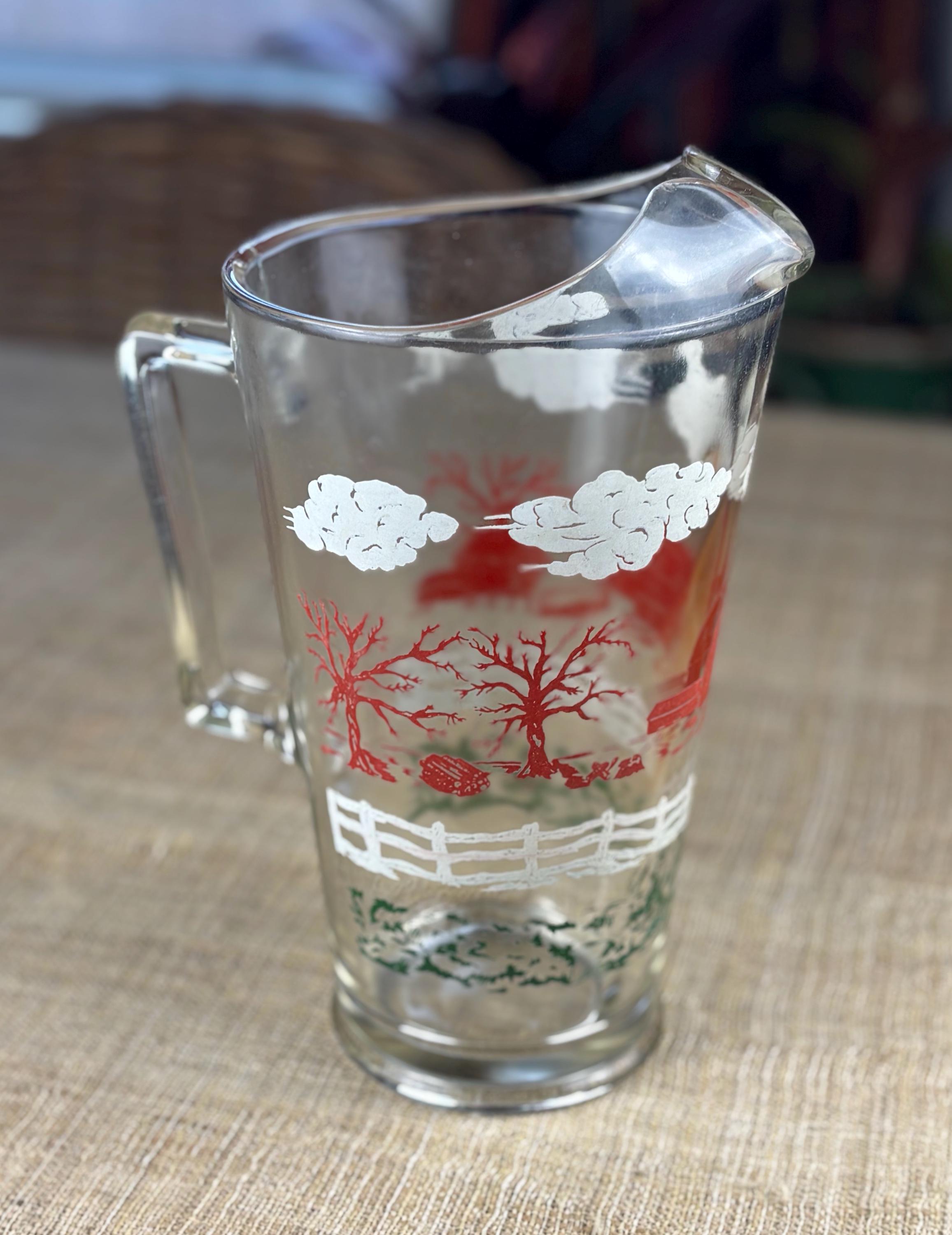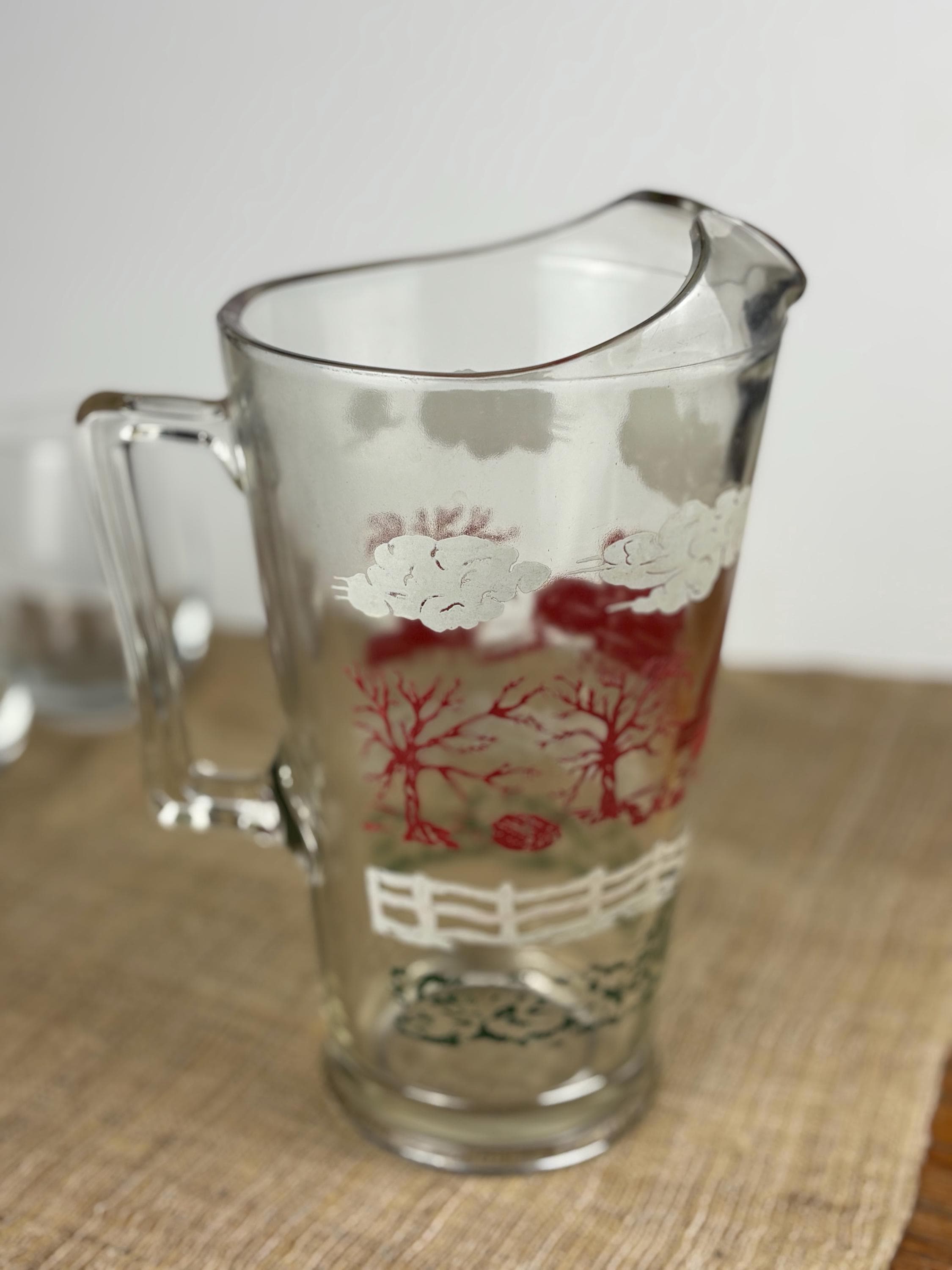 Heavy Glass Midcentury Style Pitcher with Barn Yard Farm Design.