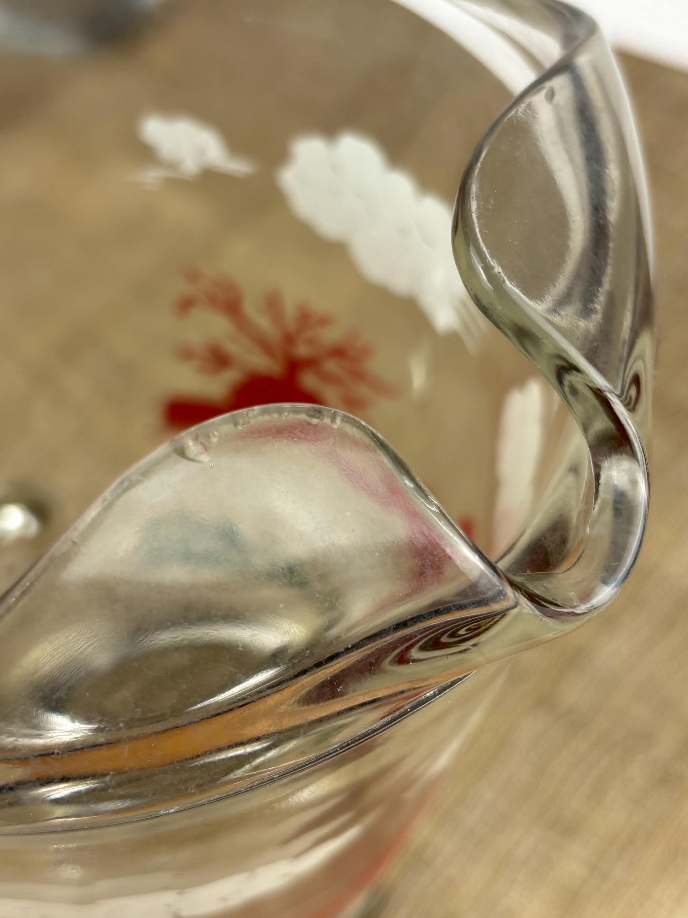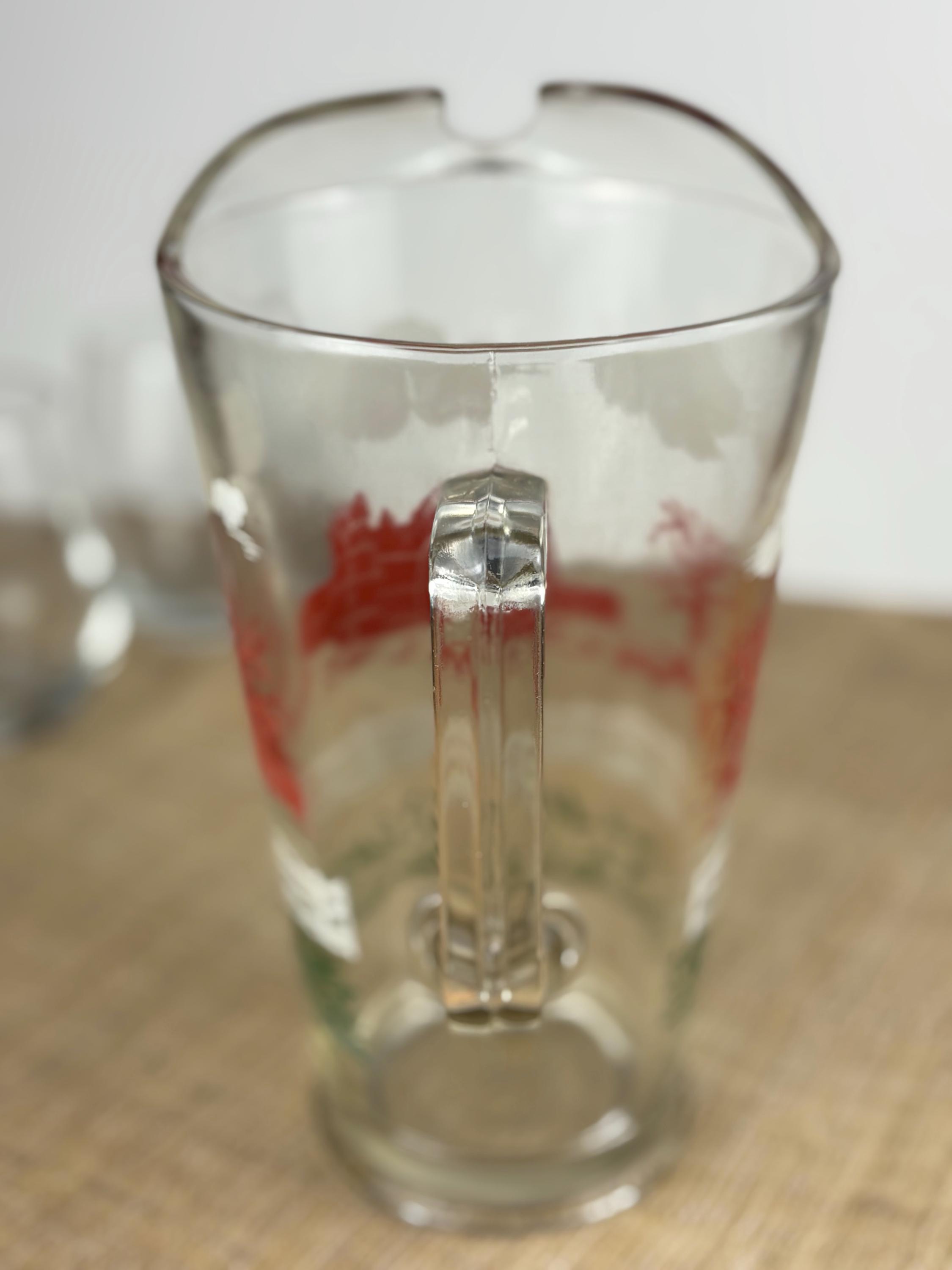 2 quart Glass Pitcher in Good condition with only some rough edges at the Ice Guard (Spout), scratches and some fading on some of the Painted Design. See images closely for details.