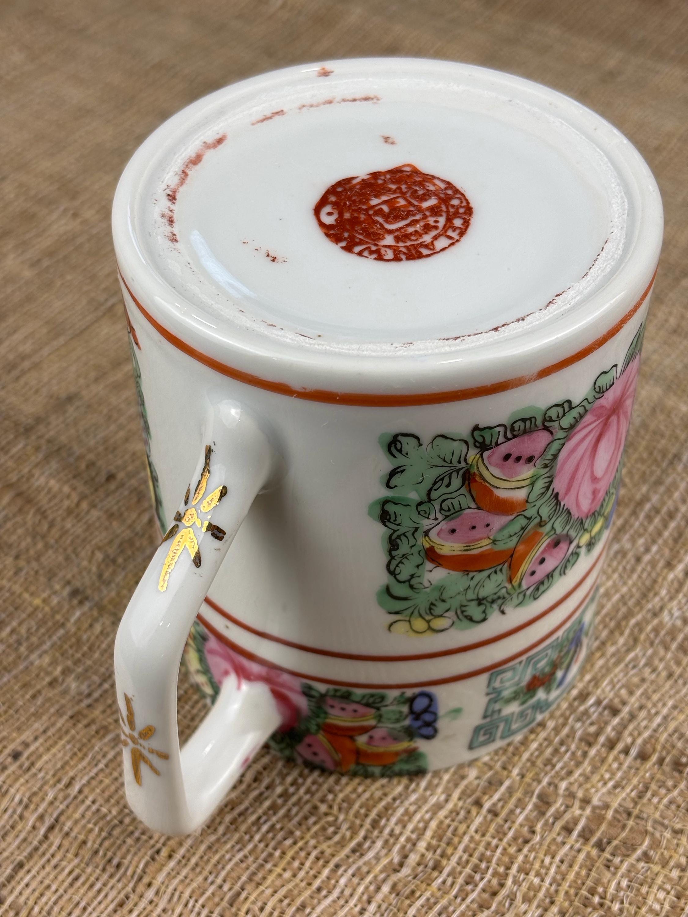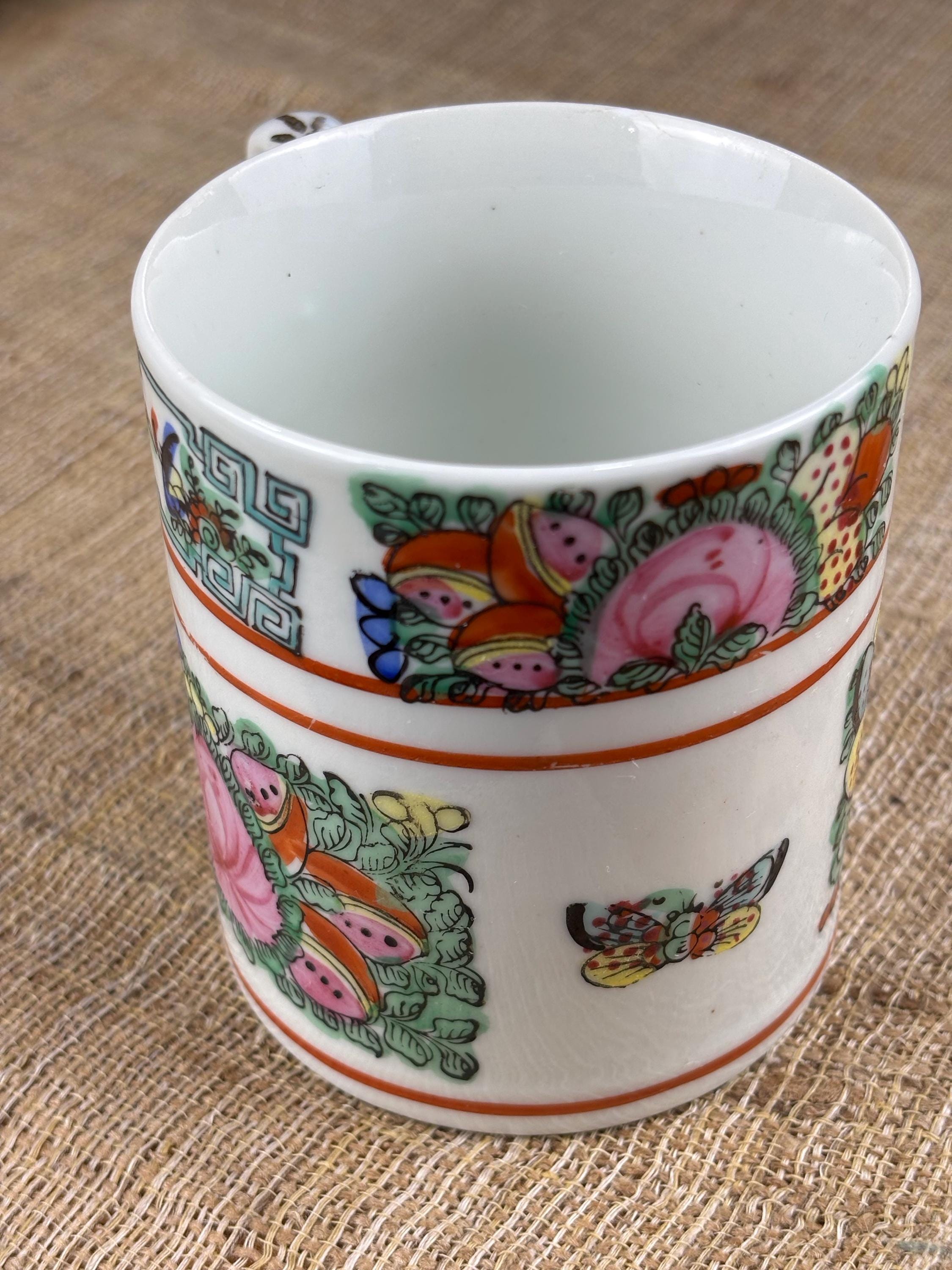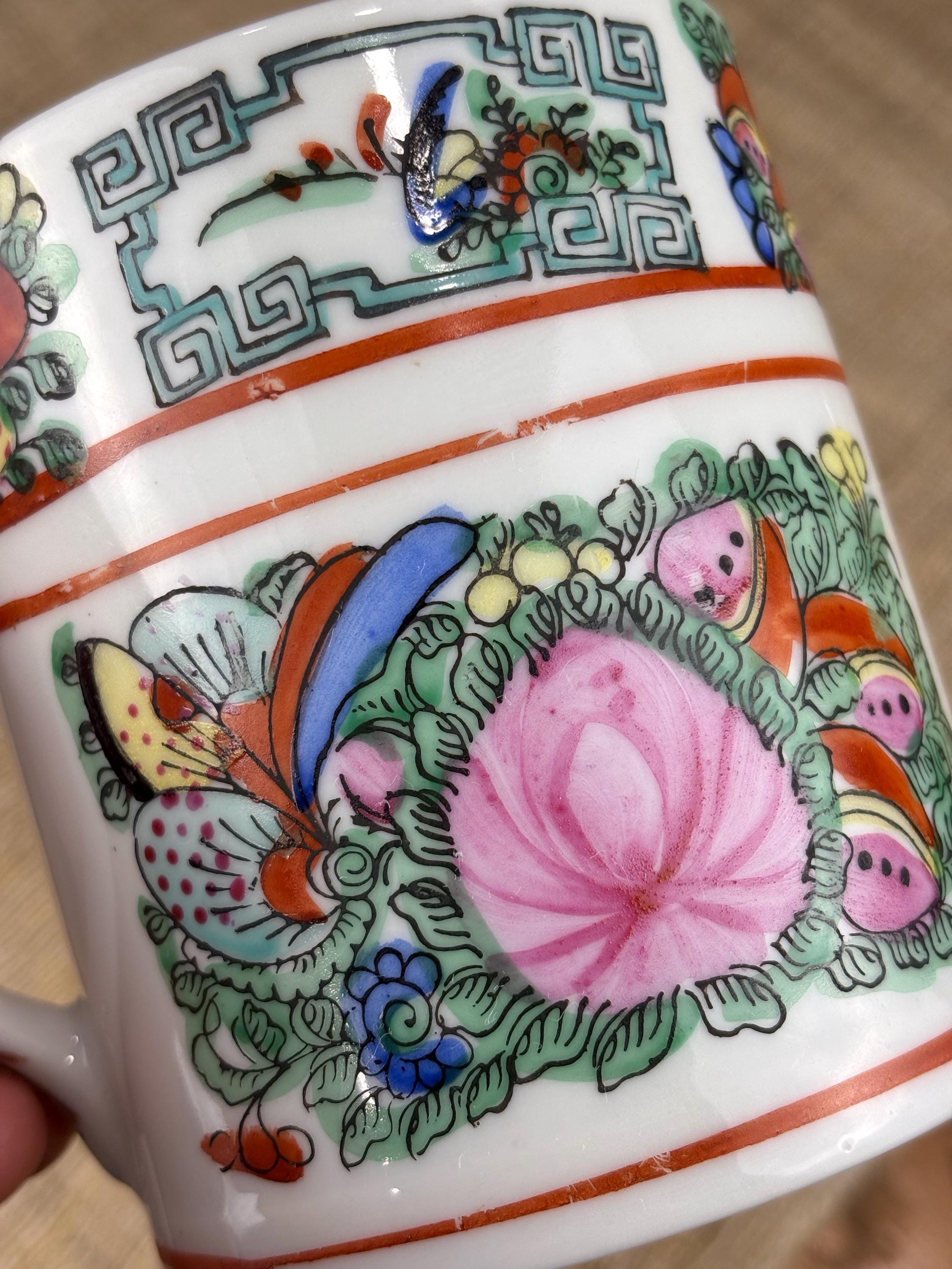 Vintage Rose Canton Porcelain Mug. Hand Painted Famille Rose “French for Pink Family” 3.7/8” Inch tall and 3.35” Inch in diameter. Good Vintage Condition with no chips or cracks. Japanese Porcelain decorated in Hong Kong.