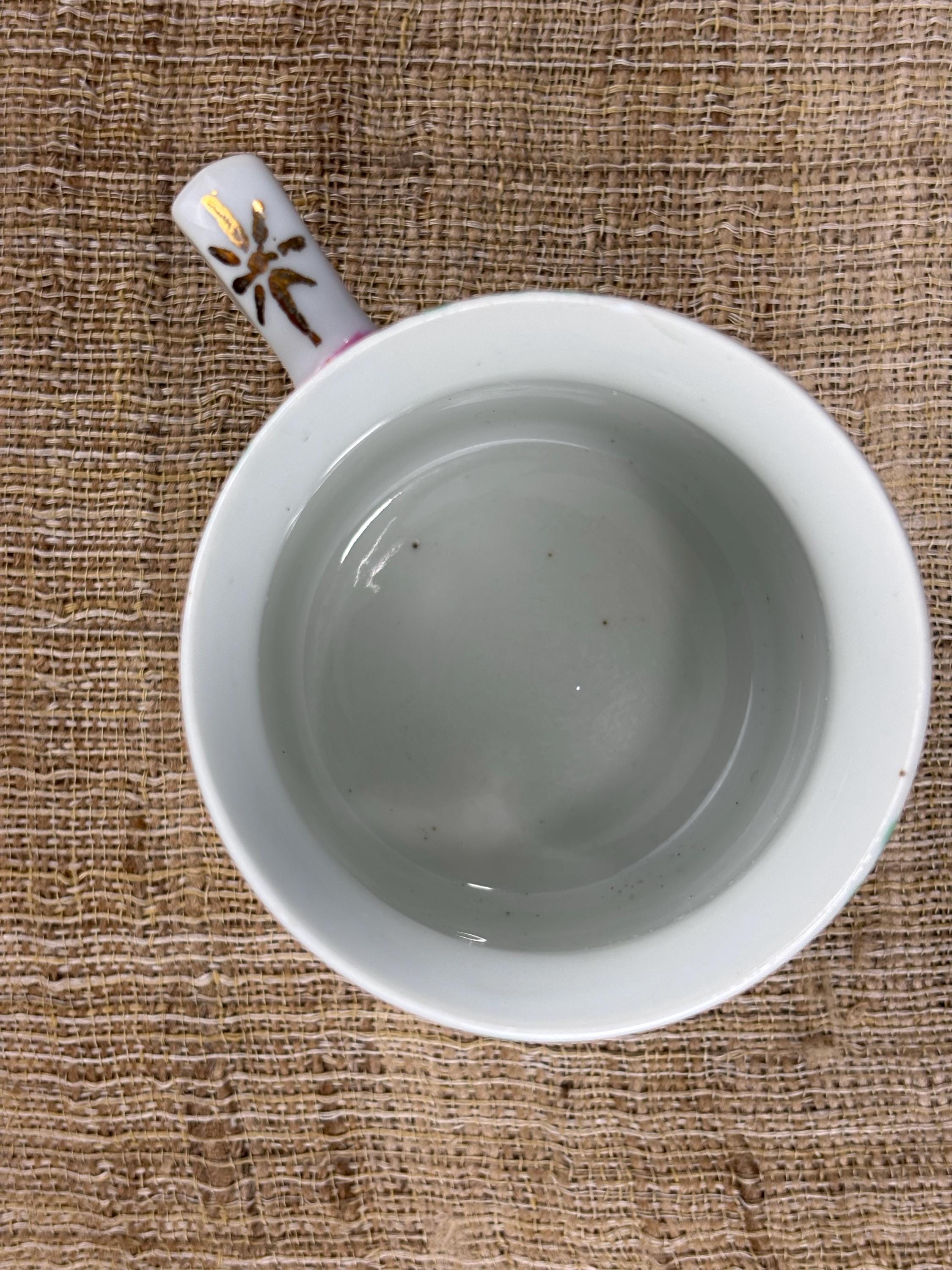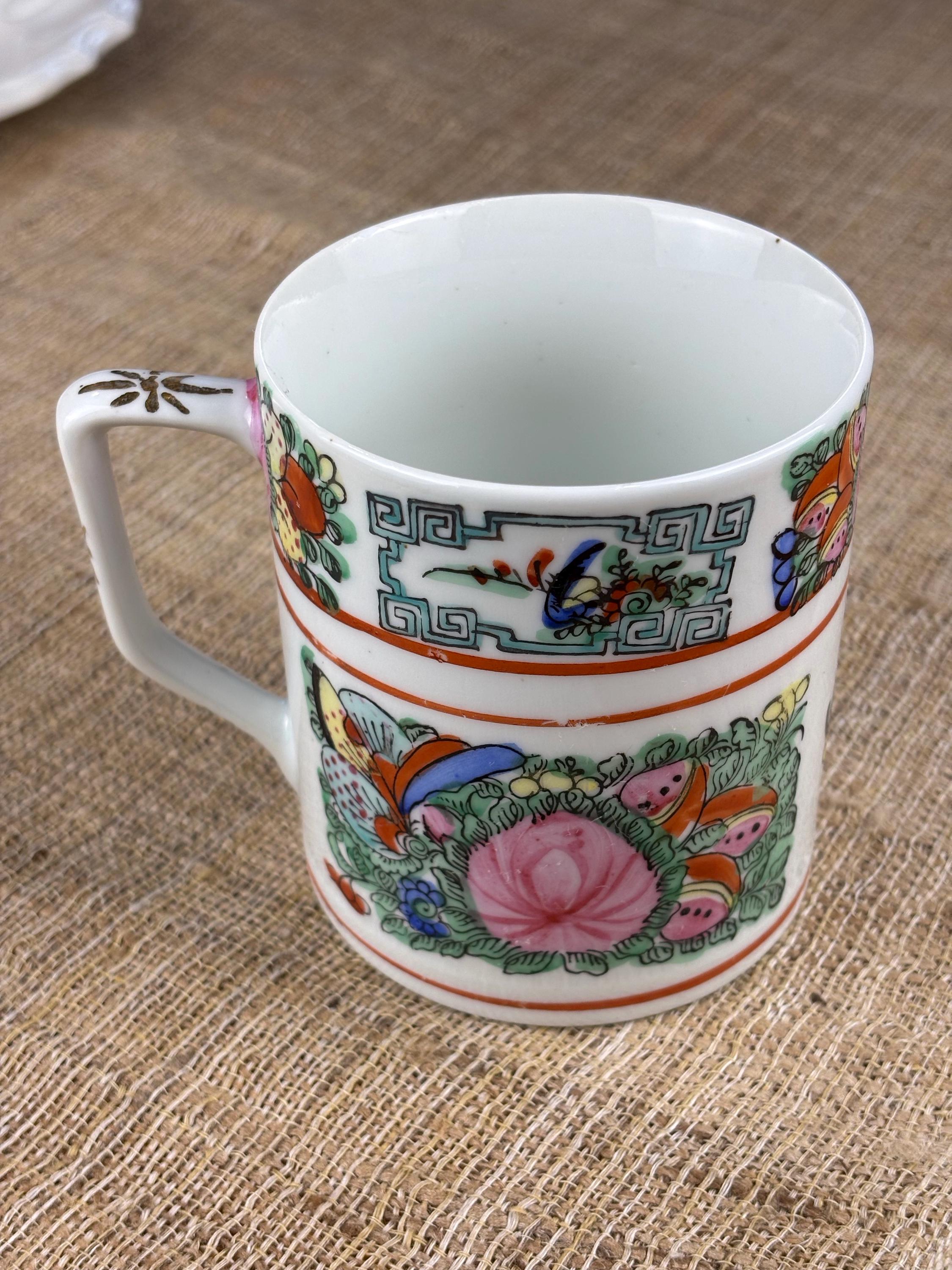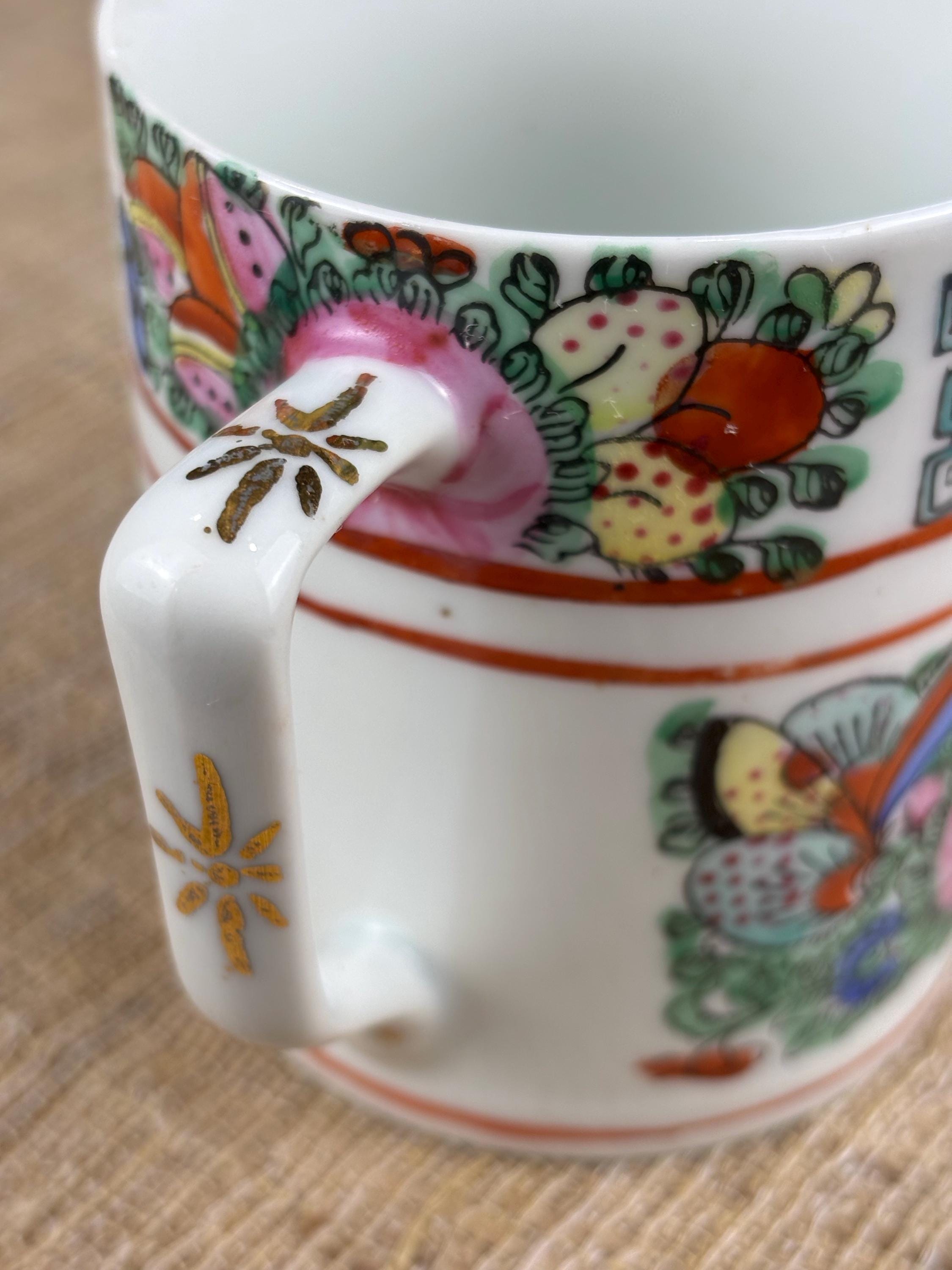 Vintage Rose Canton Porcelain Mug. Hand Painted Famille Rose “French for Pink Family” 3.7/8” Inch tall and 3.35” Inch in diameter. Good Vintage Condition with no chips or cracks. Japanese Porcelain decorated in Hong Kong.