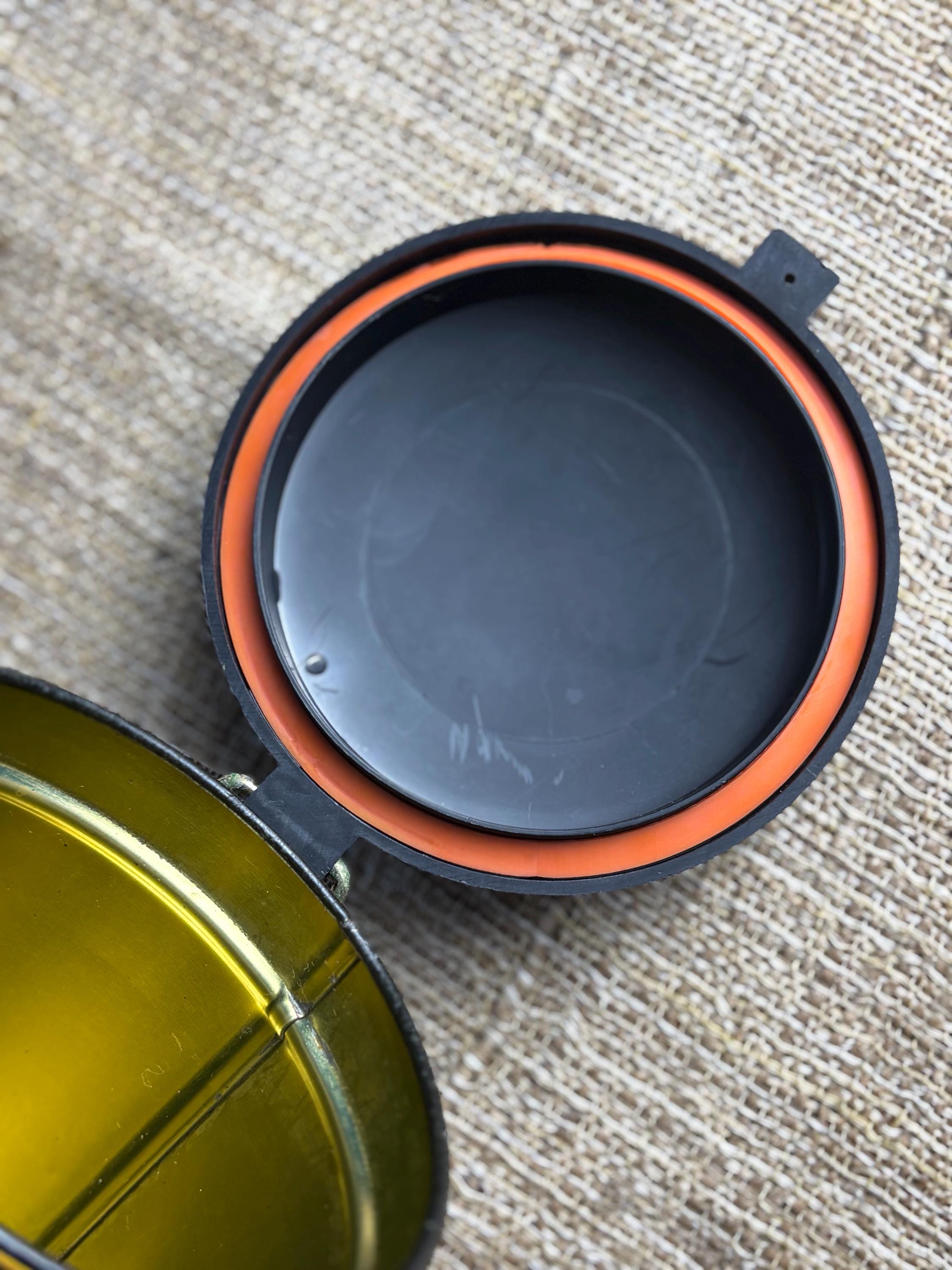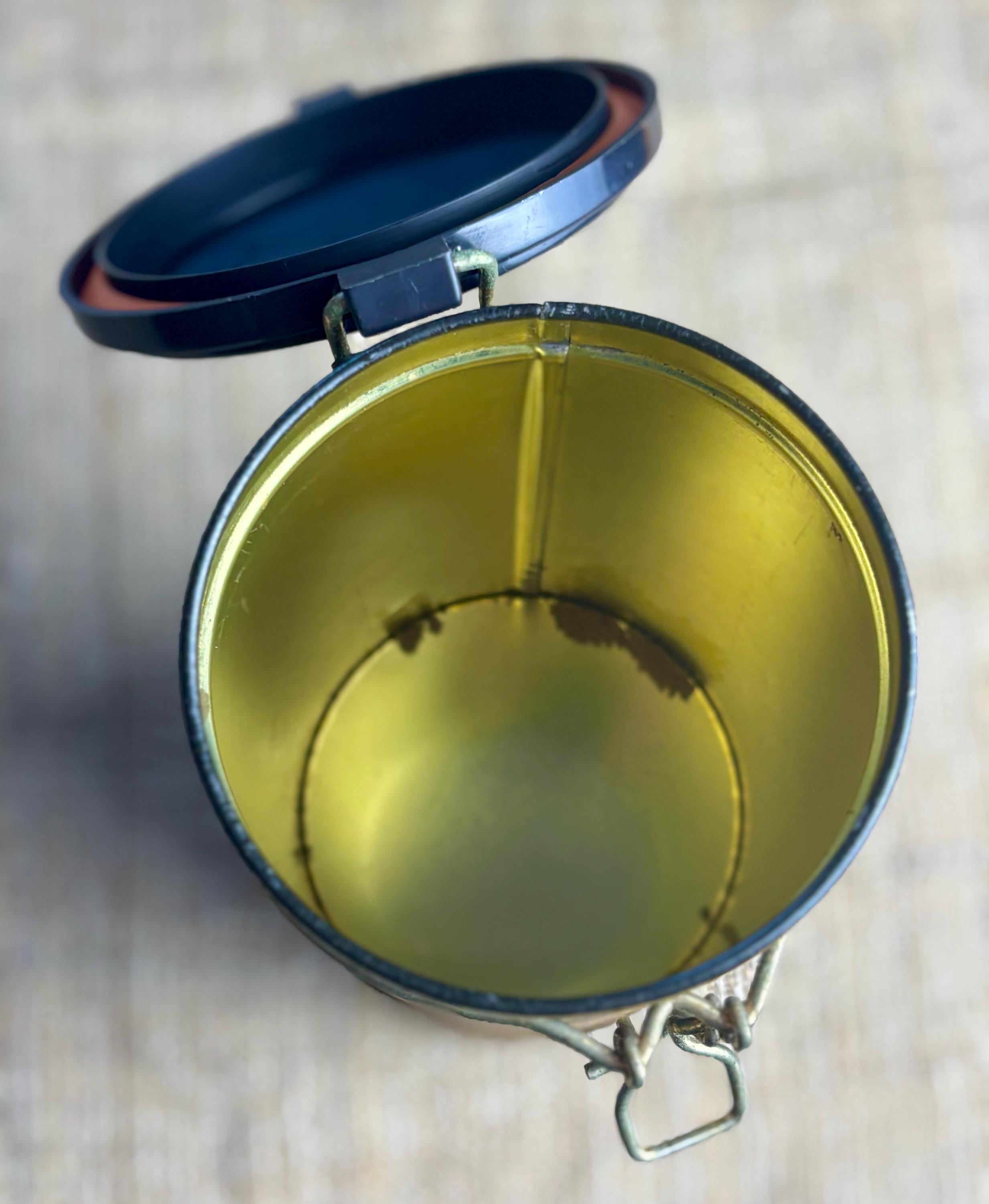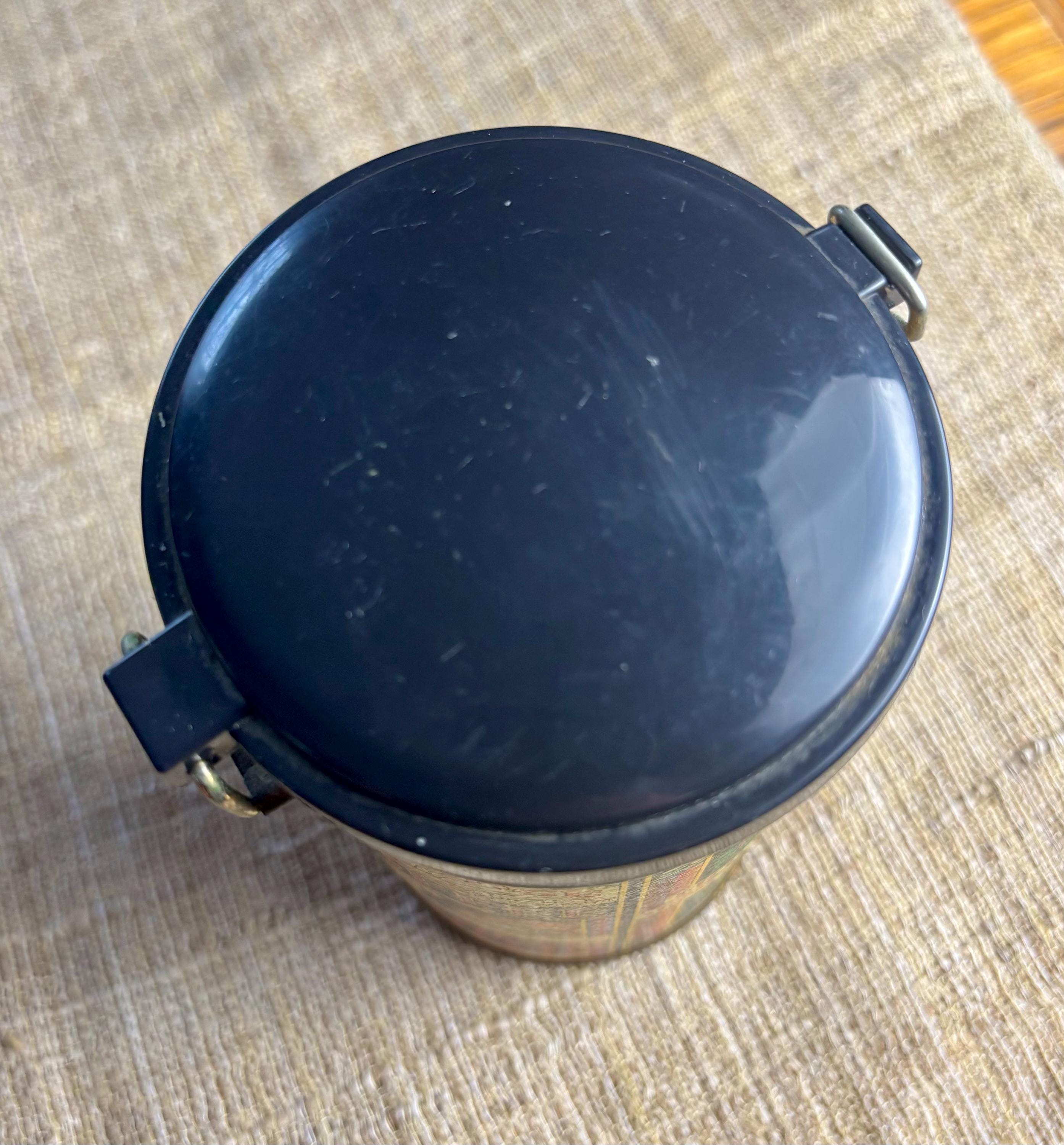 Vintage Decorative Latch-able Coffee Tin With Black Plastic Lid. Reproduction from the 1980’s, this tin sits at 6.25” inches tall and 3.5” inches in diameter.