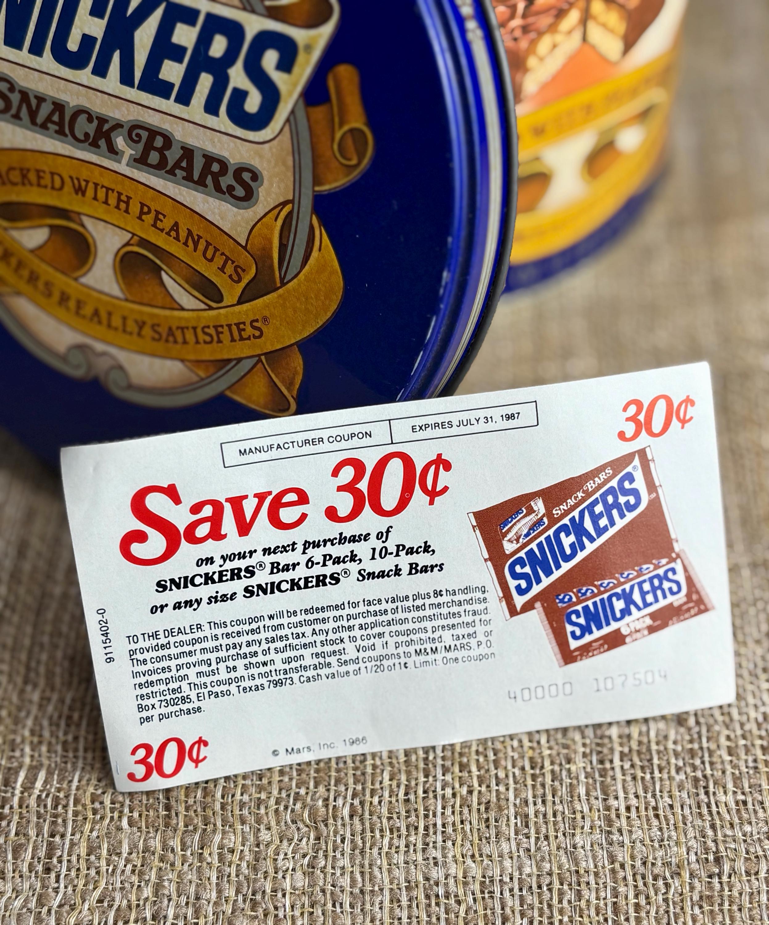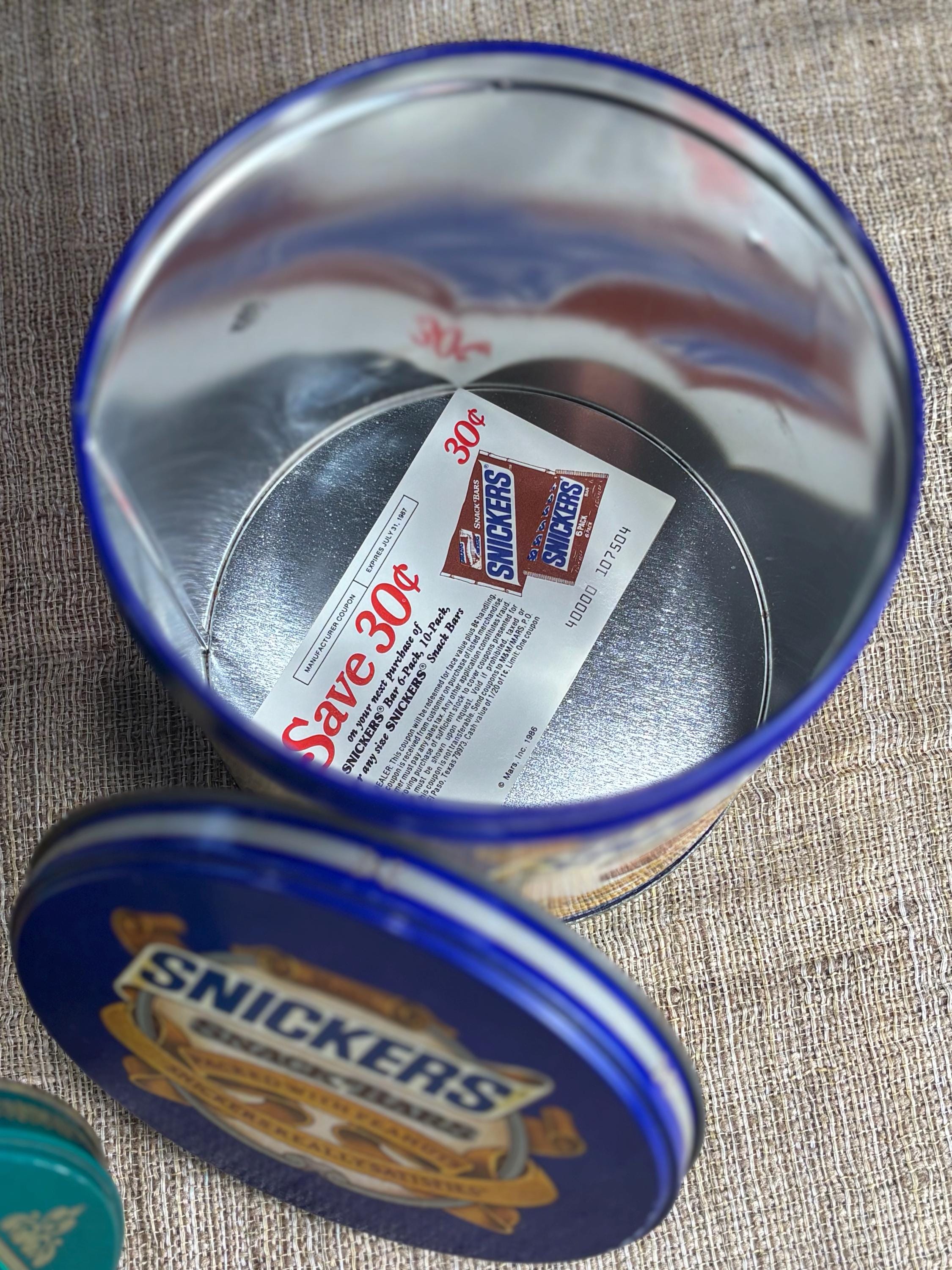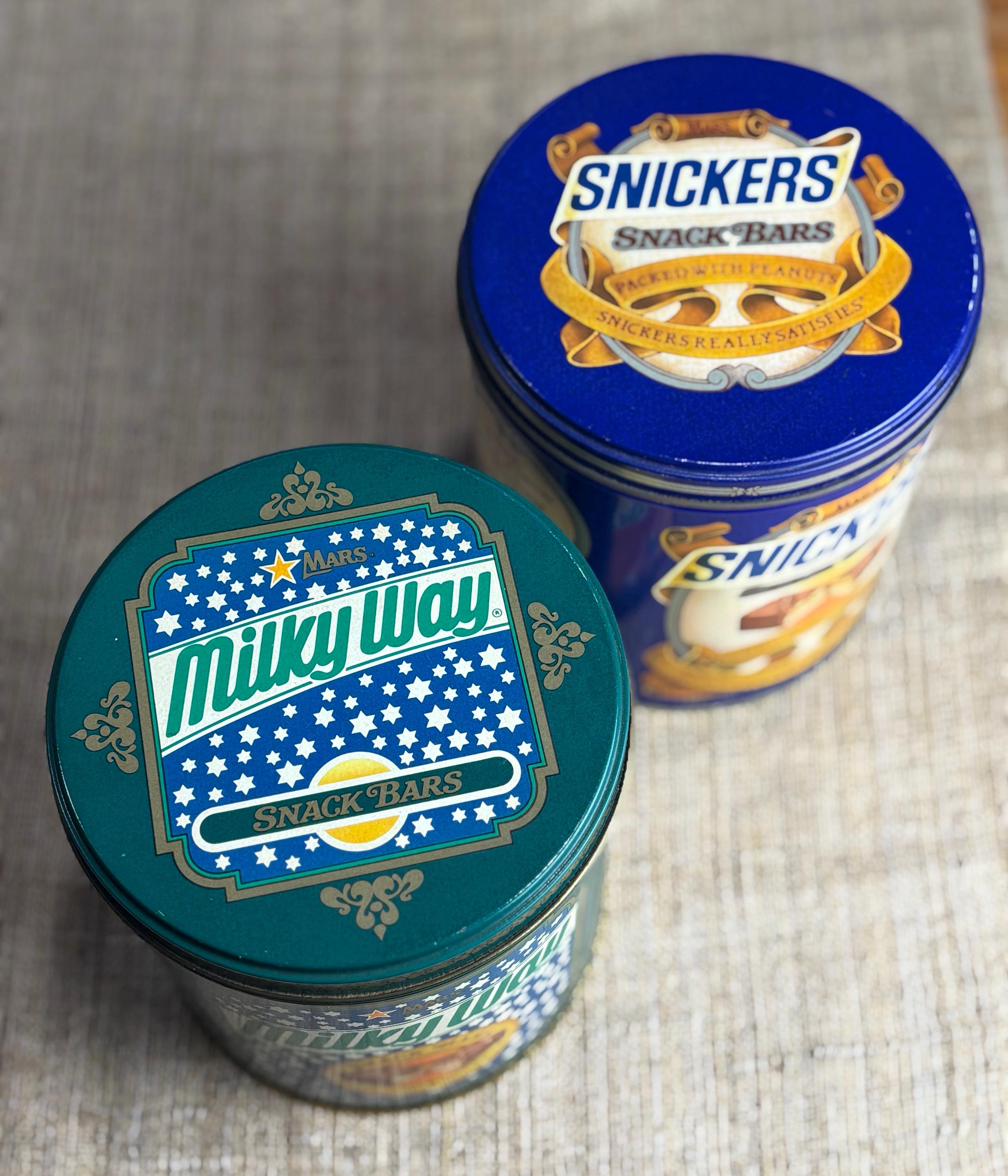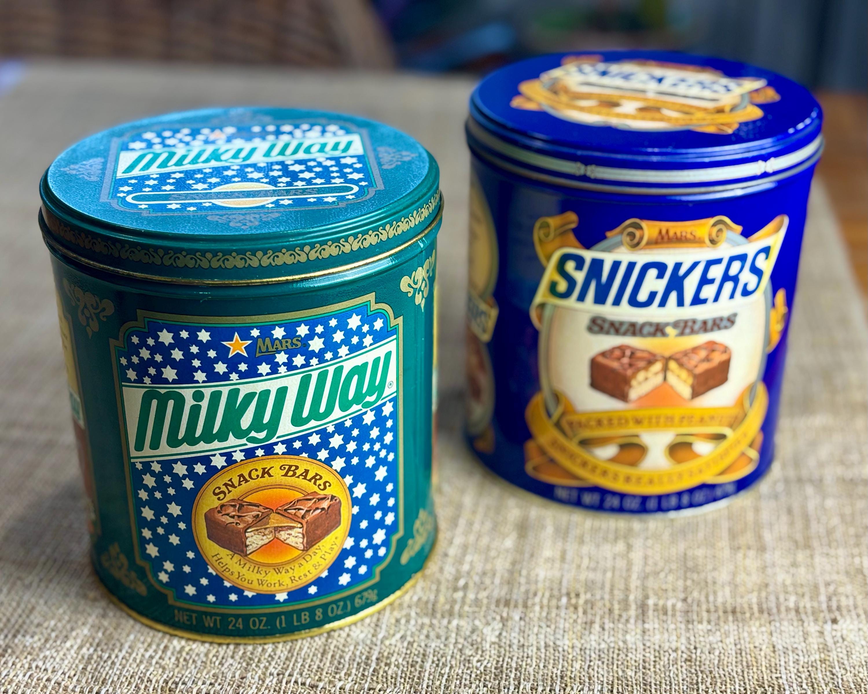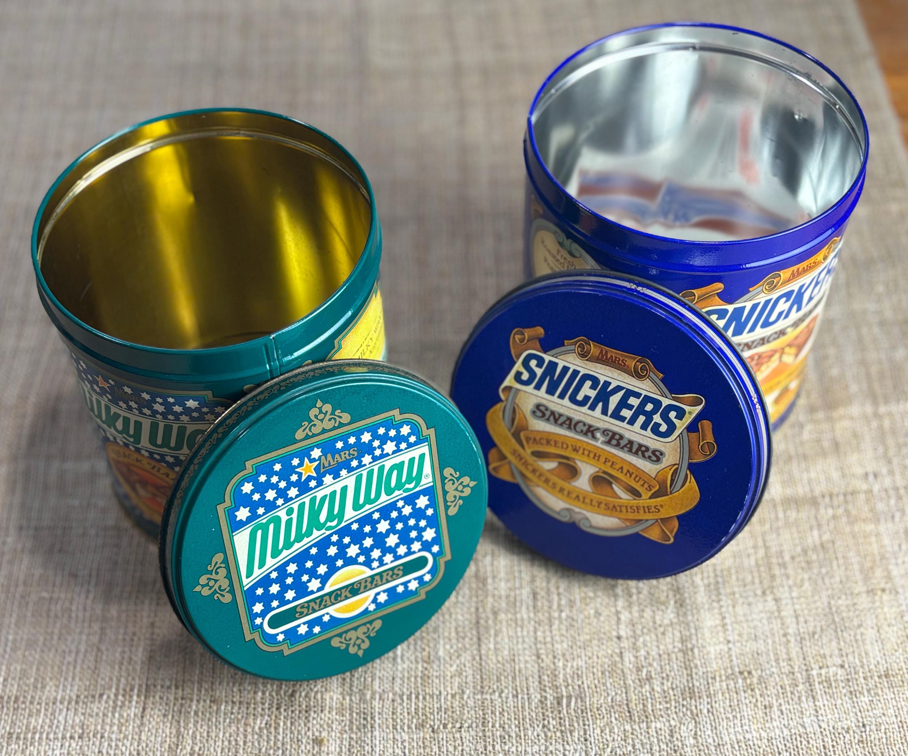 Vintage Collectible Candy Bar Tins. Milky Way and Snicker Tins From 1987, these tins are in Good Vintage Condition with some scratches and dings but overall In Good condition!