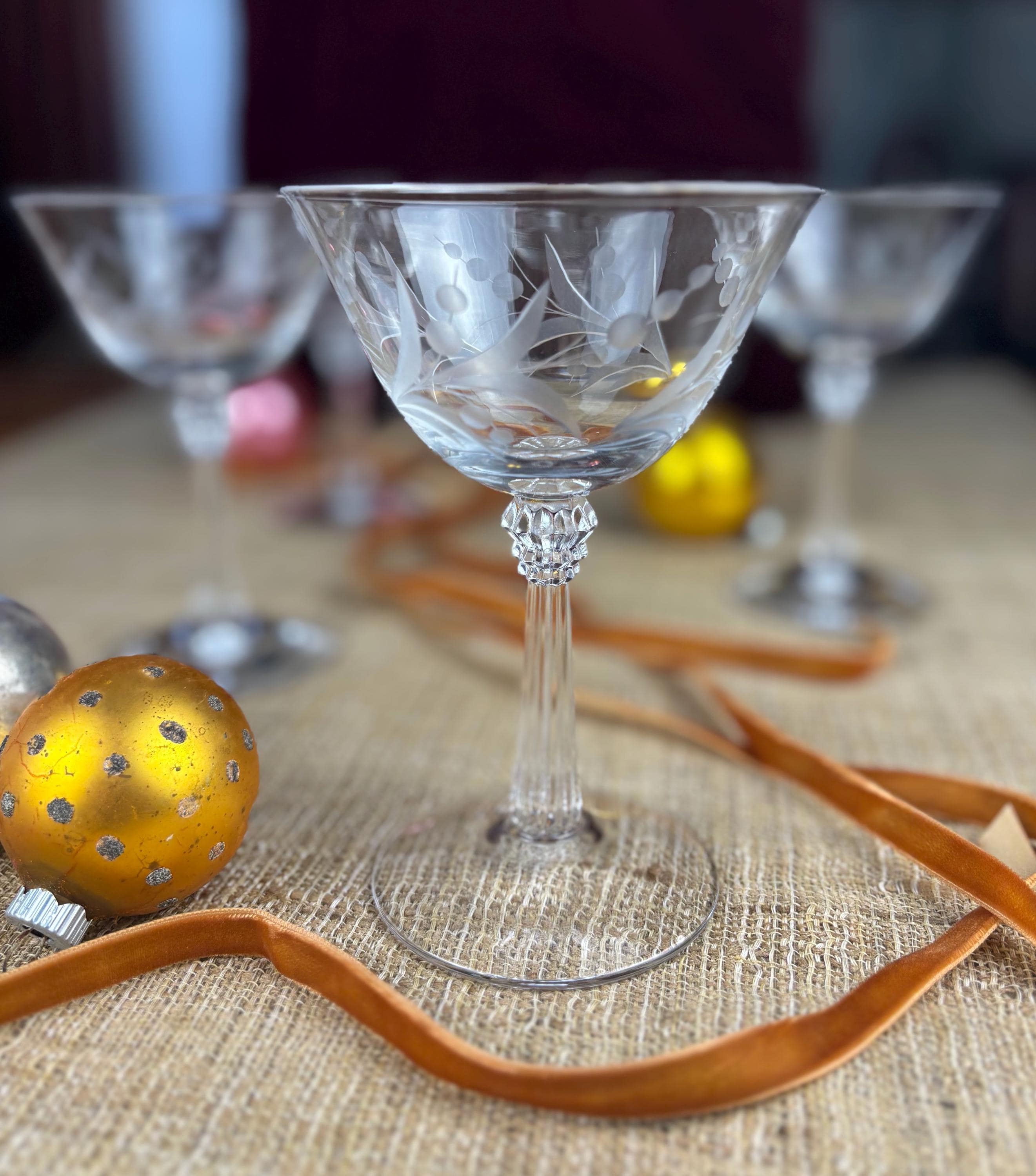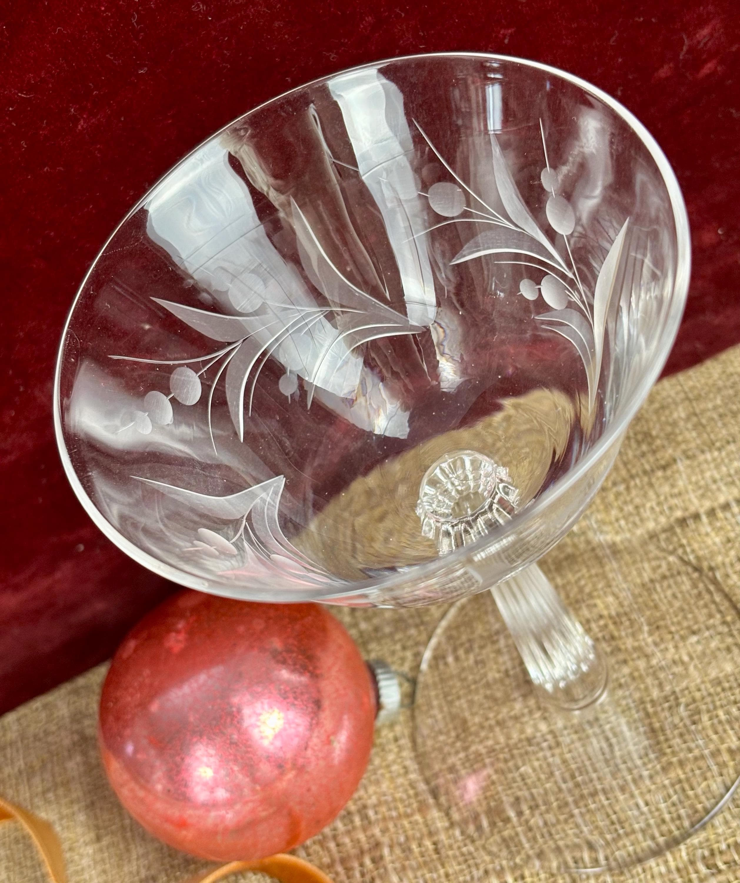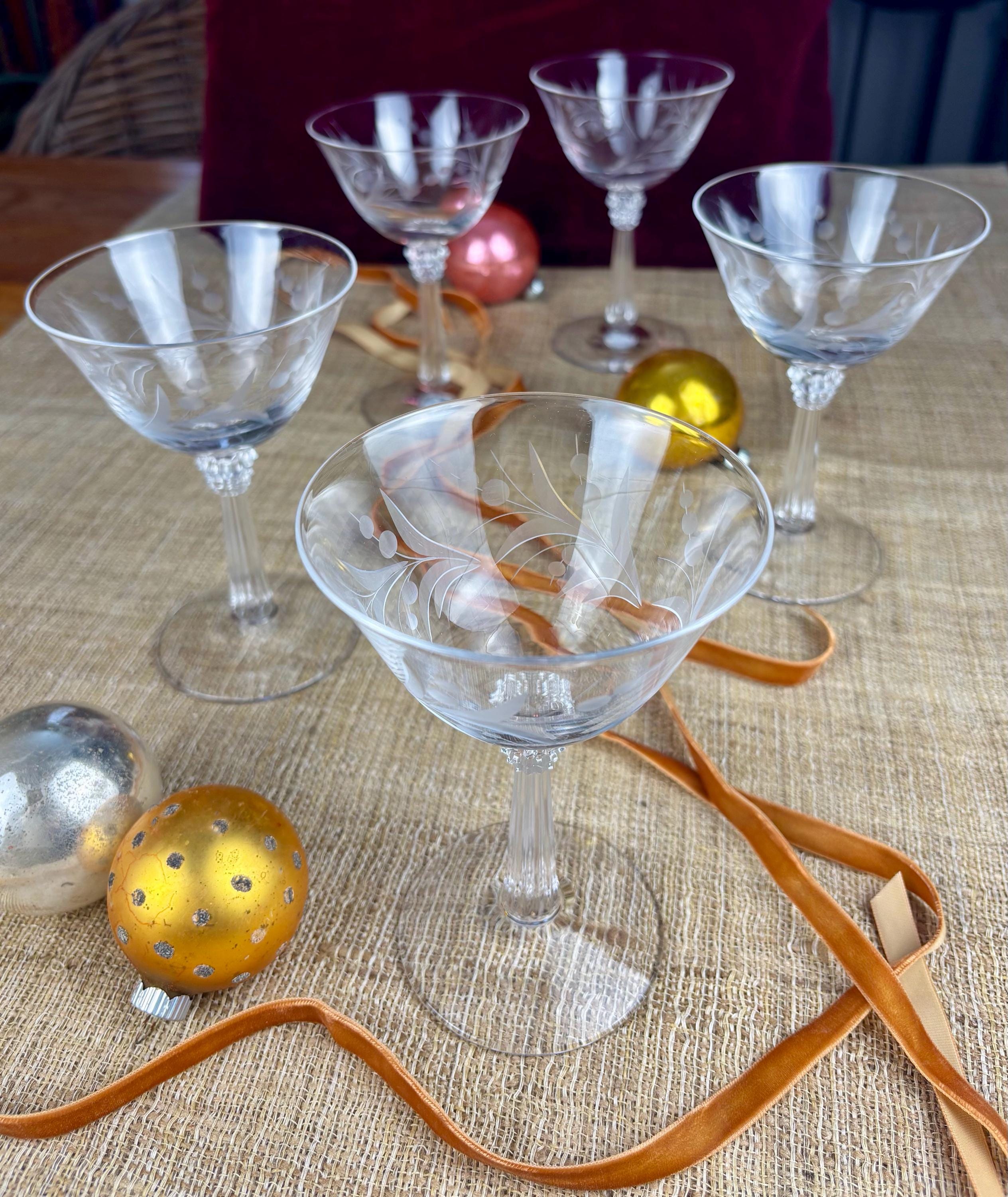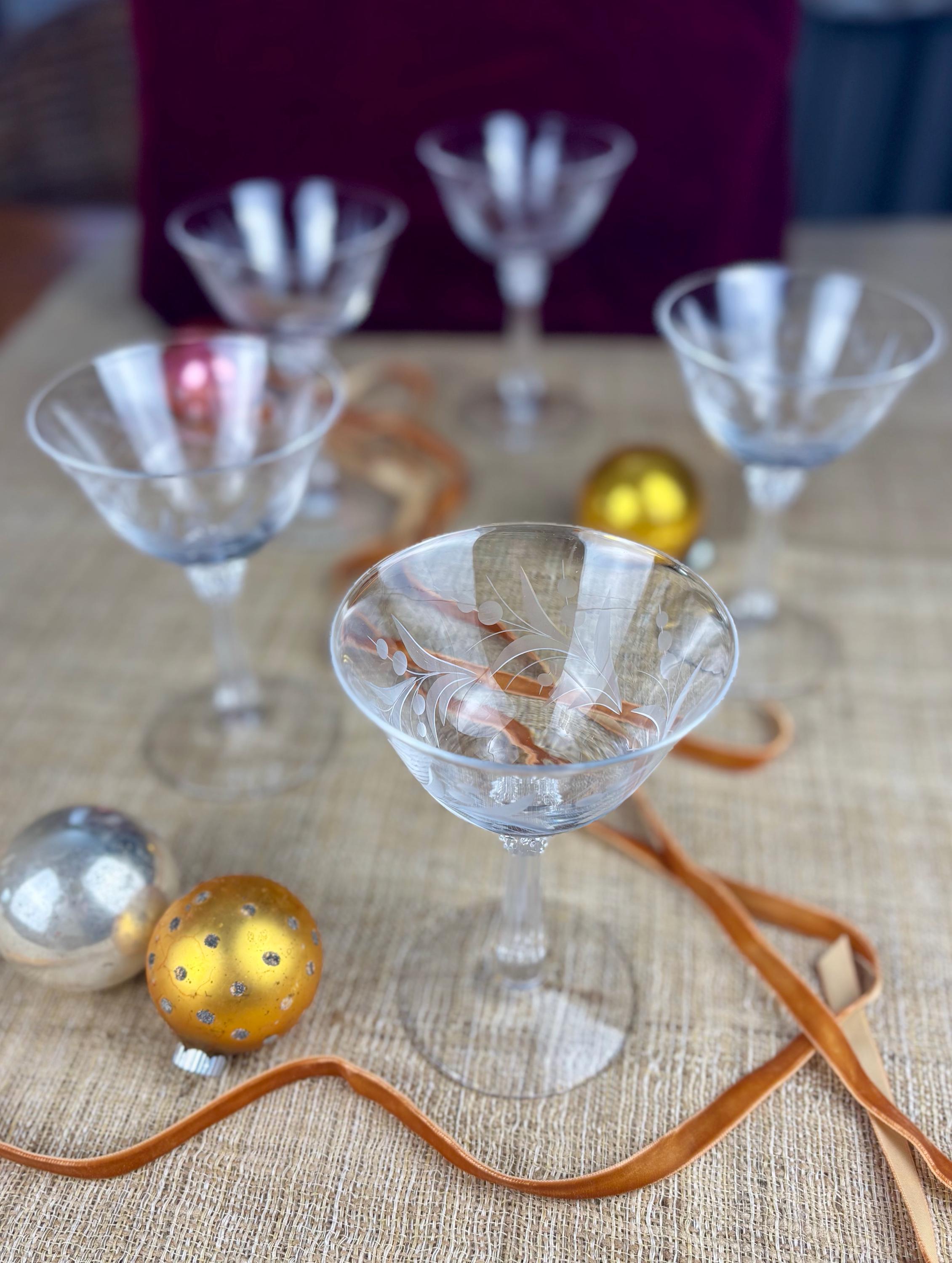 Each glass is 5.5” inches tall and 3.75” inches in diameter at the top rim. Etched Glass with a stylized Leaf and Berry Pattern and Fluted Stem.