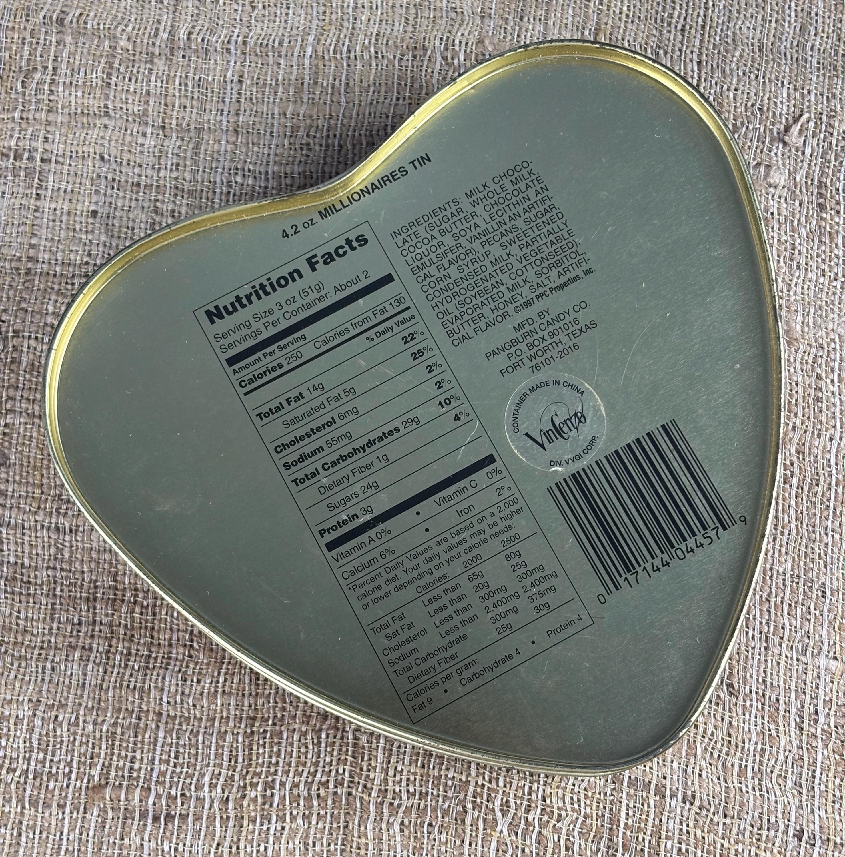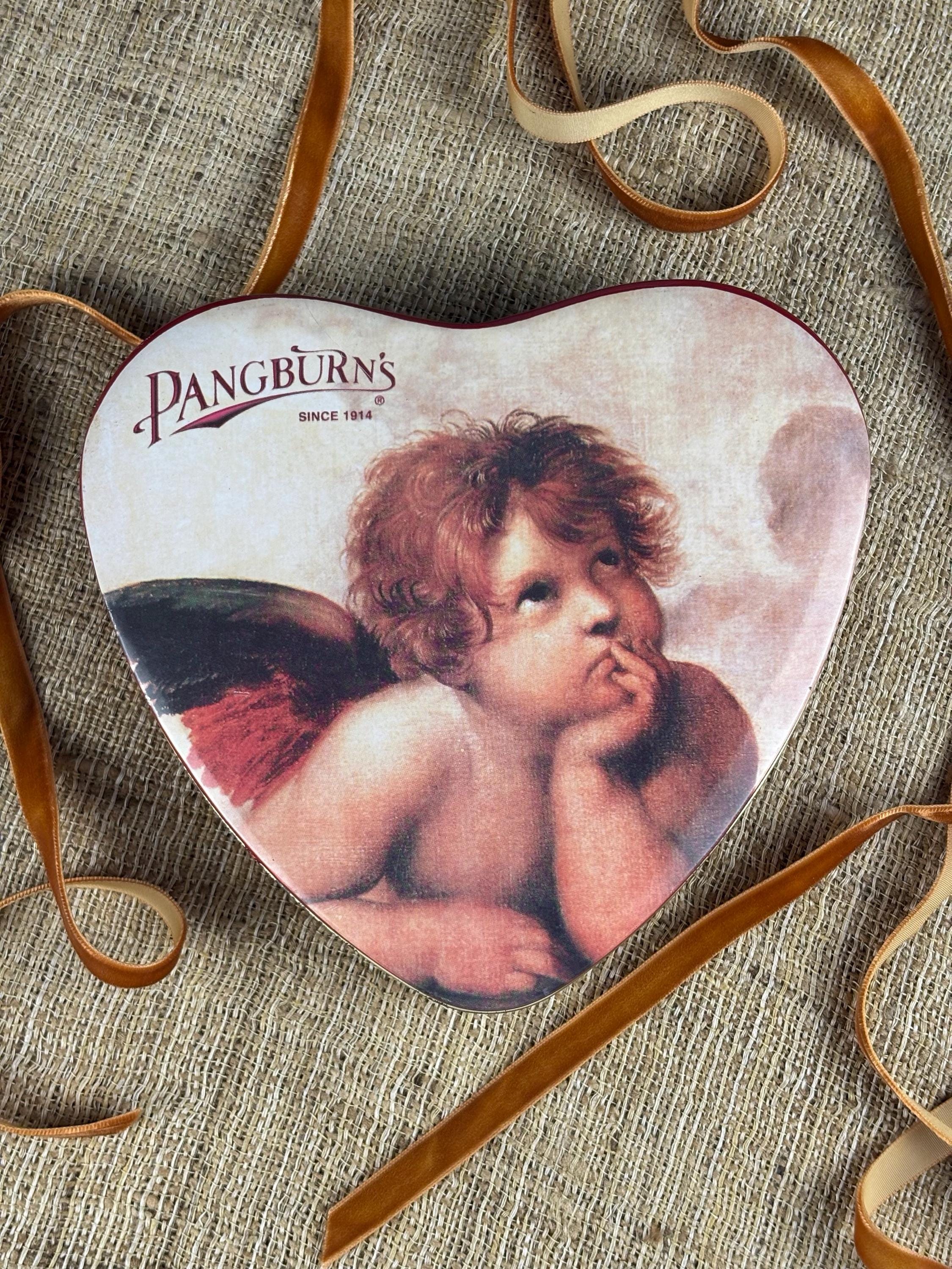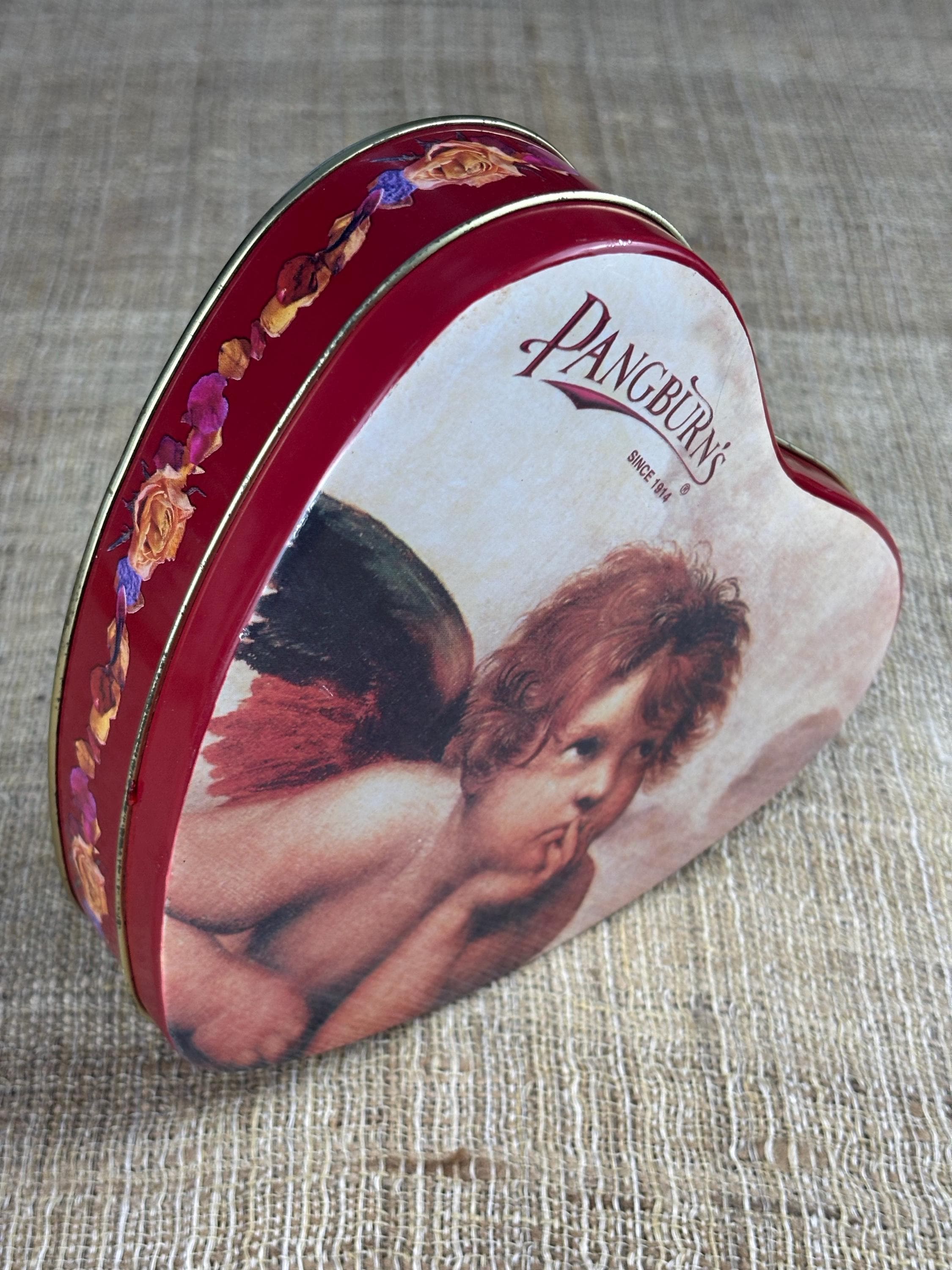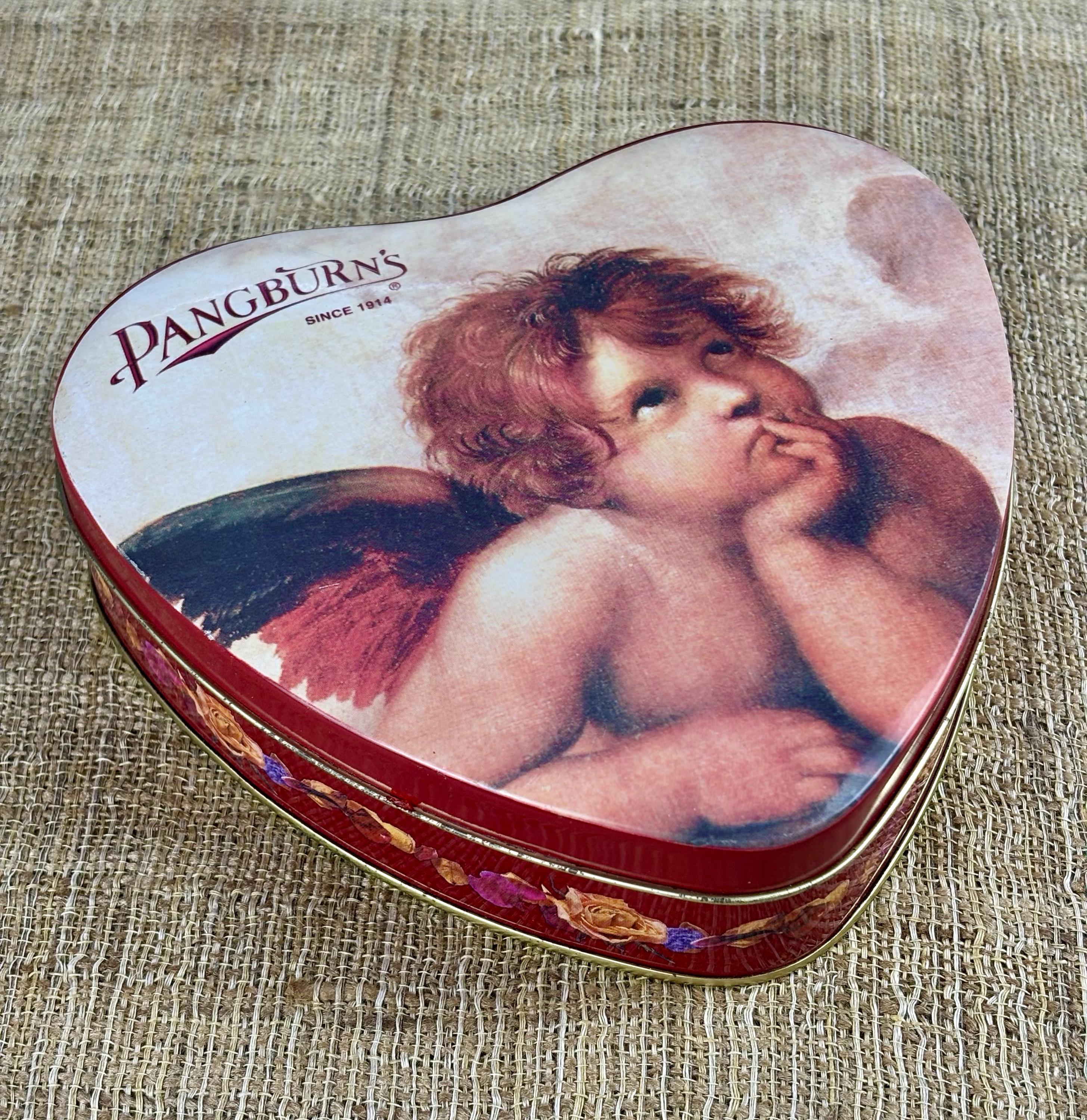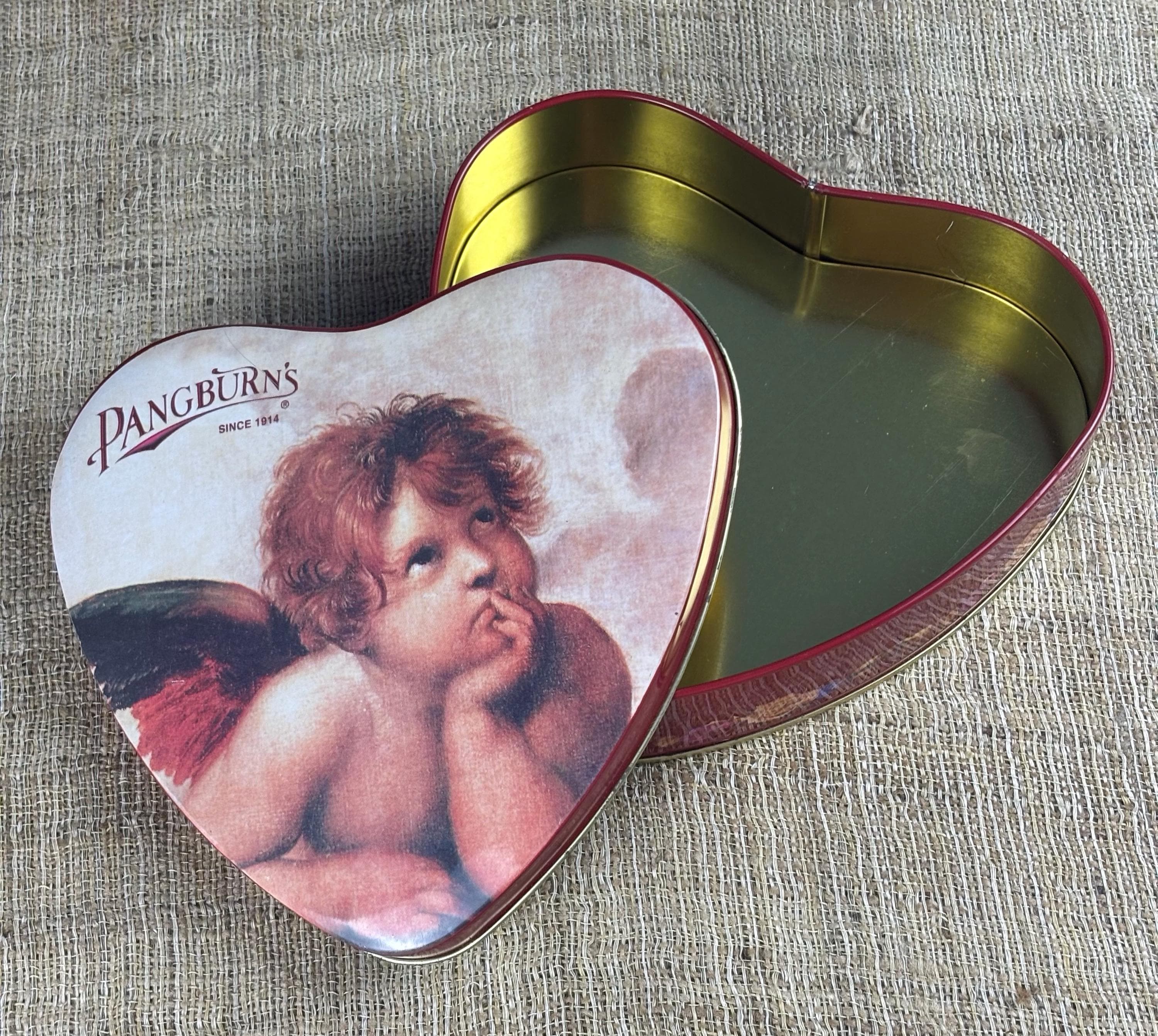 Vintage Heart Shaped Tin Box, Contains No Candy! Tin by Pangburn’s Since 1914 with Cherub.