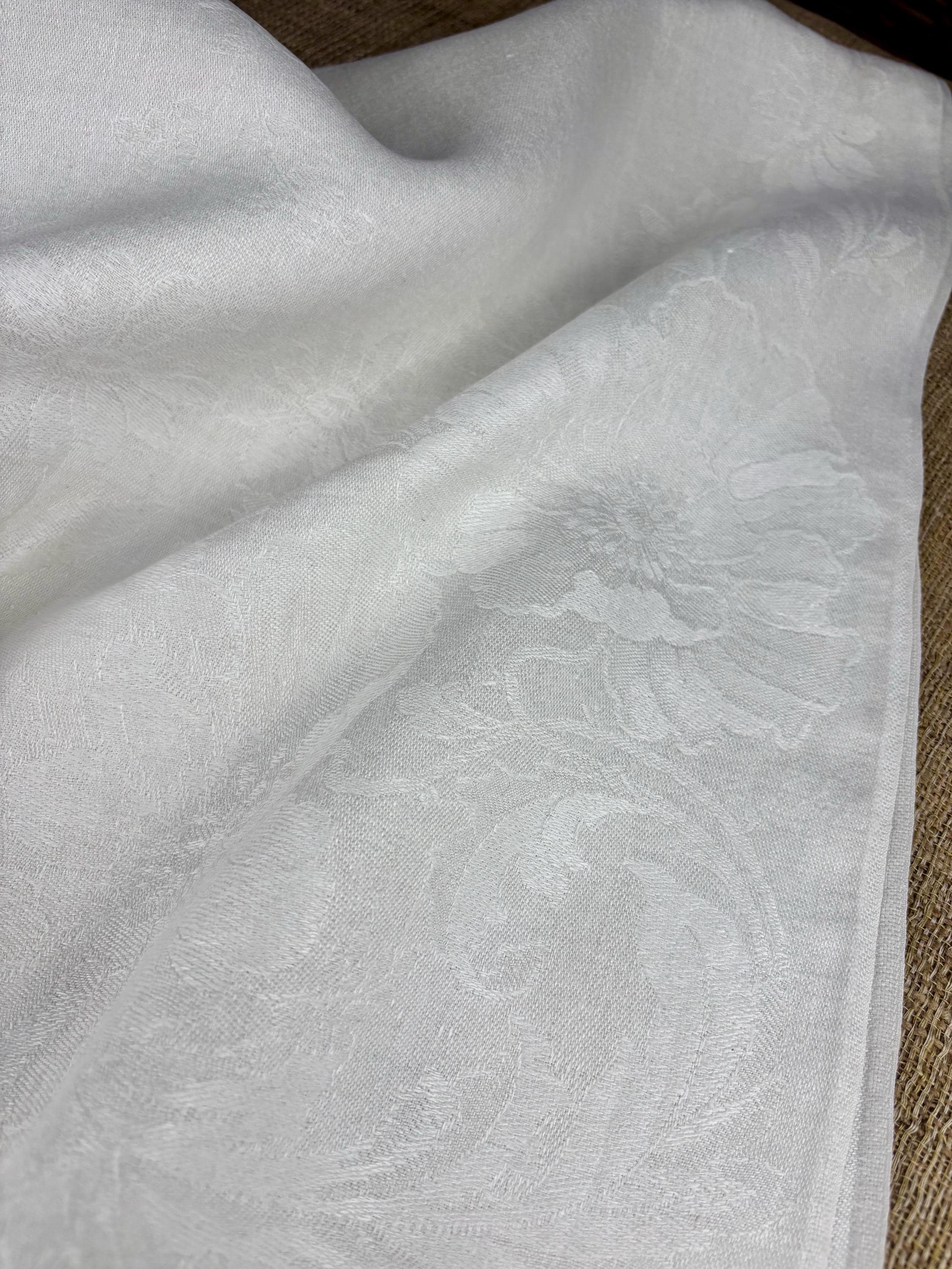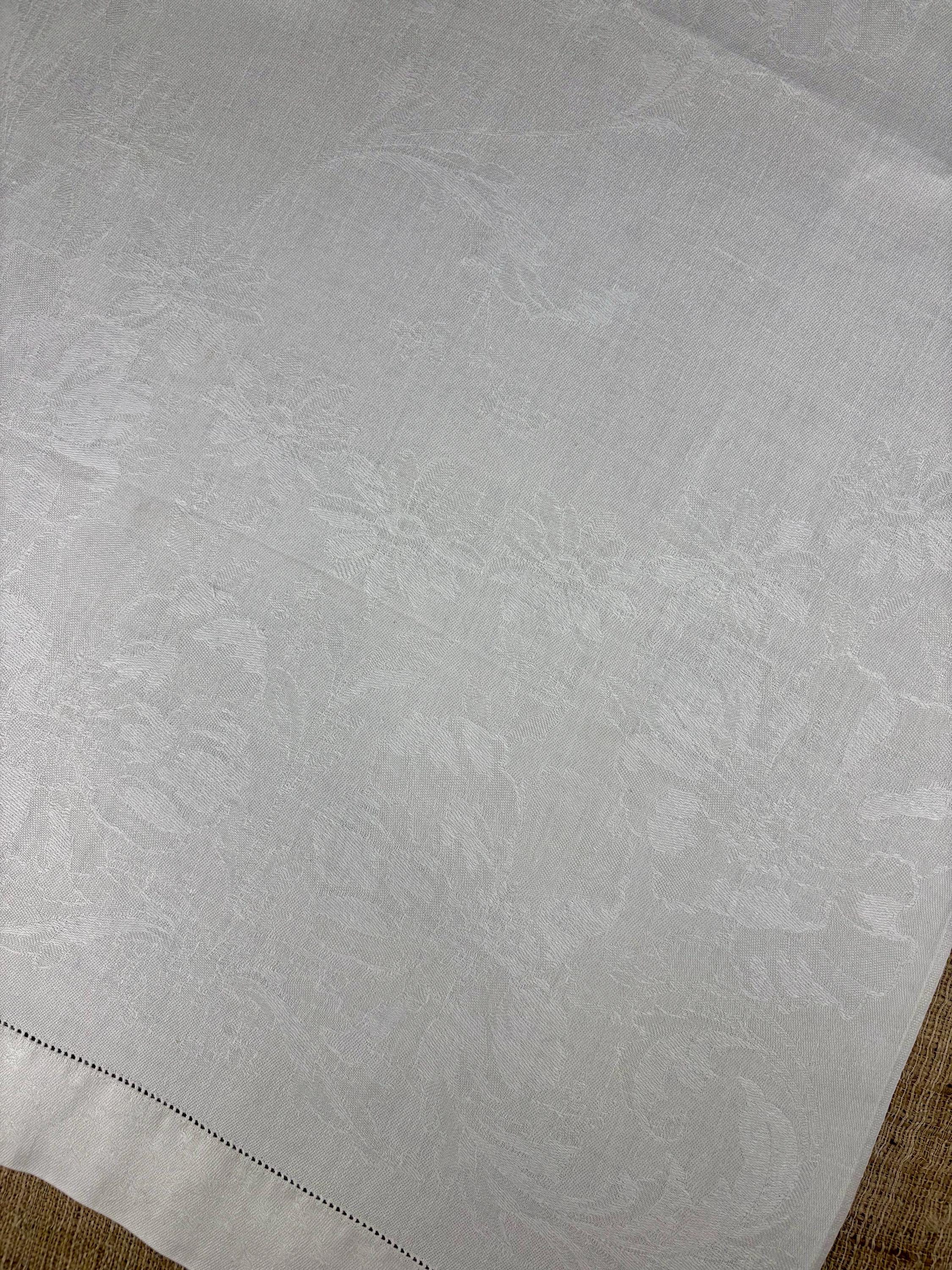 White Fabric featuring a Pattern of Daisies and Poppies with a Fleur-de-lis pattern on the Hem Stitched Borders at Each End.