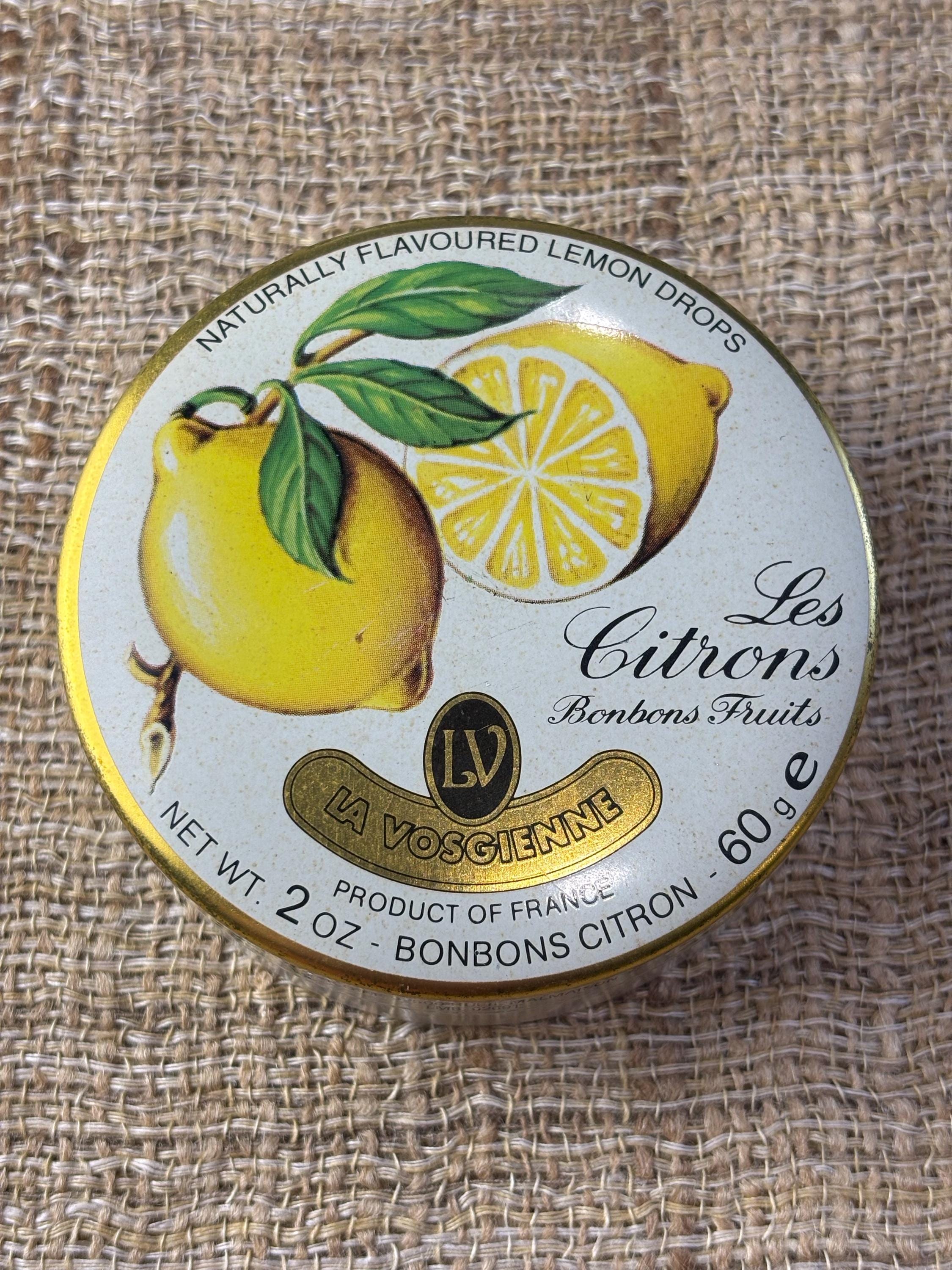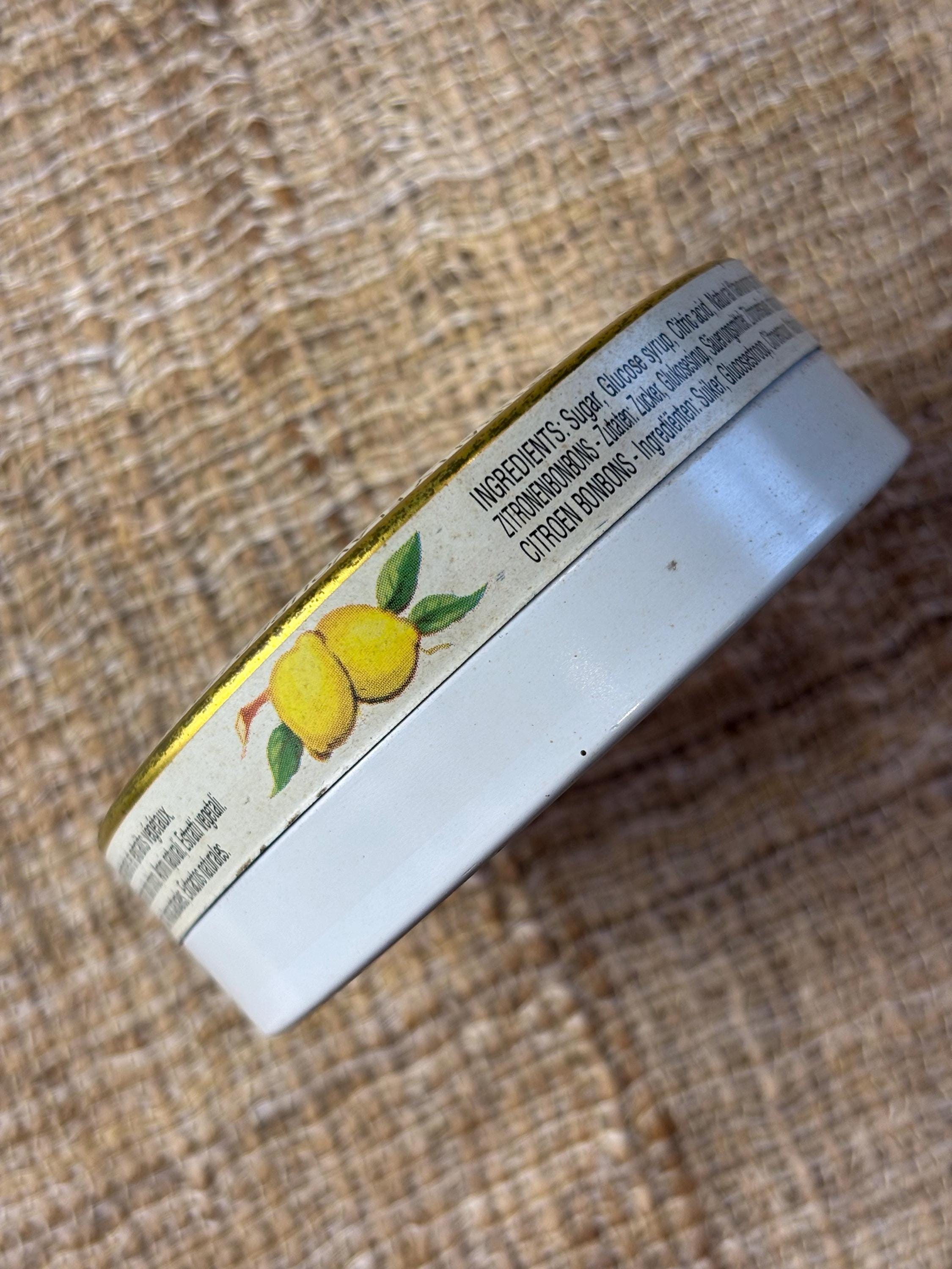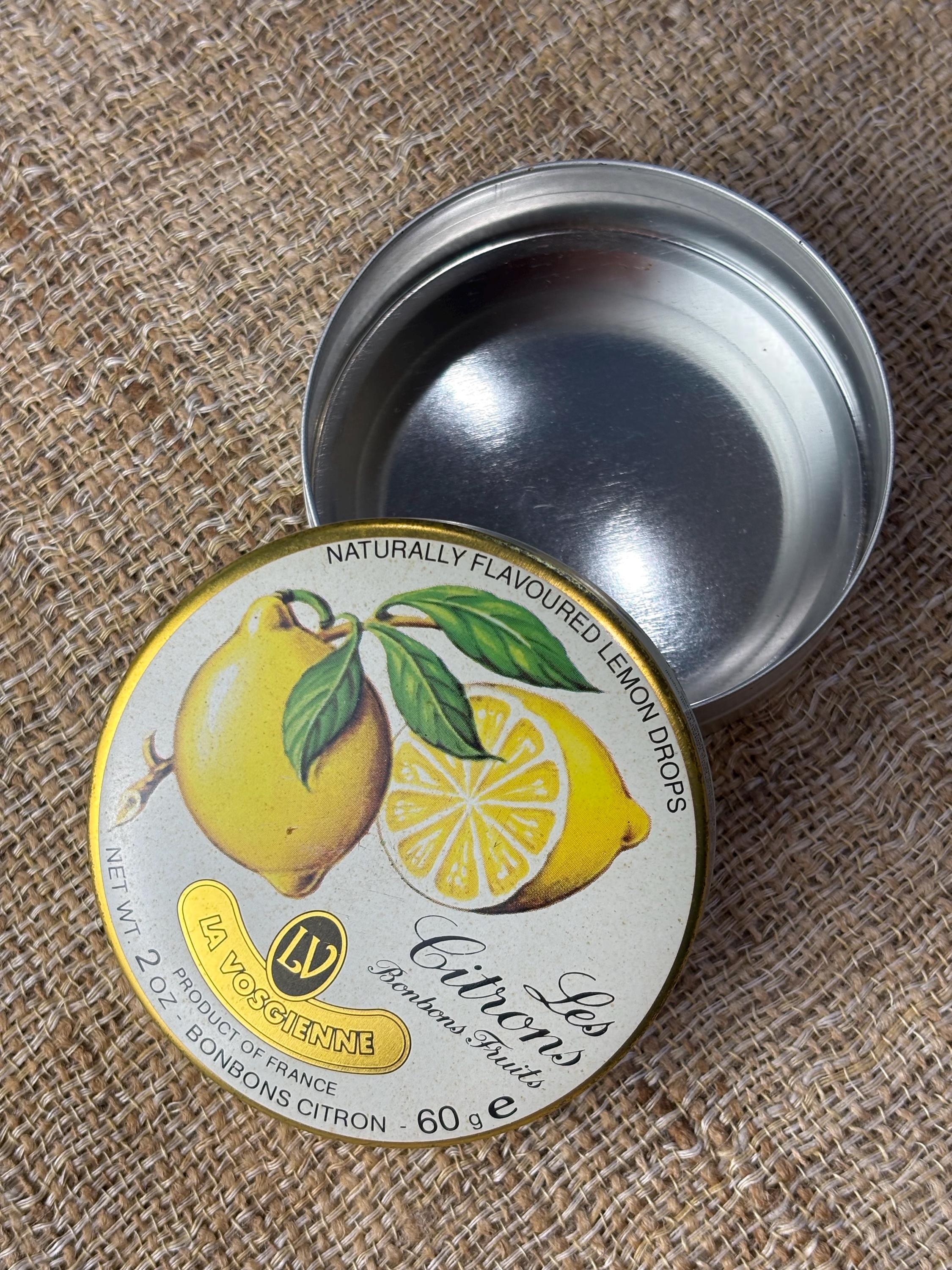 Small Vintage LesCitron Lemon Drop Tin. 3” inches in diameter and 1” inch tall